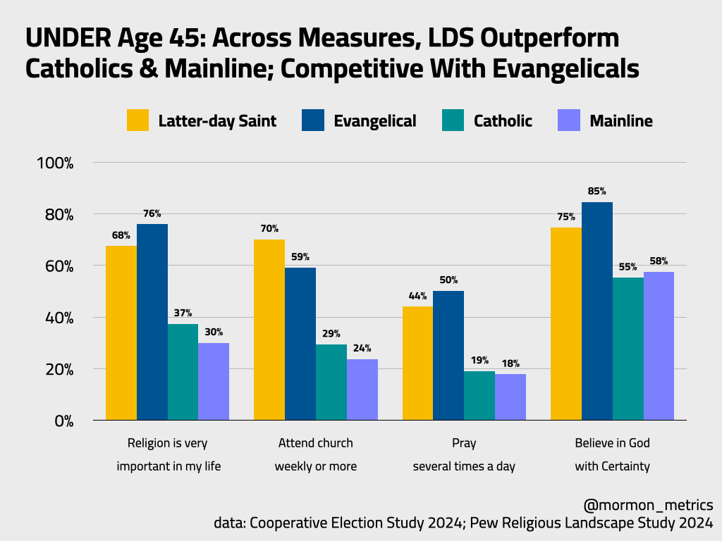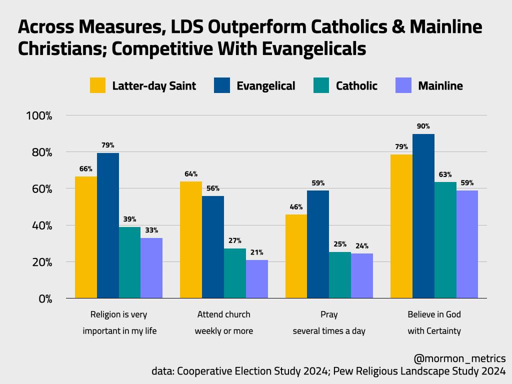 The snapshot picture actually favors the institution. Latter-day Saints in 2024 show higher levels of religious practice and commitment than Catholics, Mainline Christians, and on some measures, even Evangelicals. The members who show up — who pray, who attend, who say their faith is central to their lives — are doing so at rates that most Christian traditions in America can’t match. That’s not spin. That’s what the data shows.