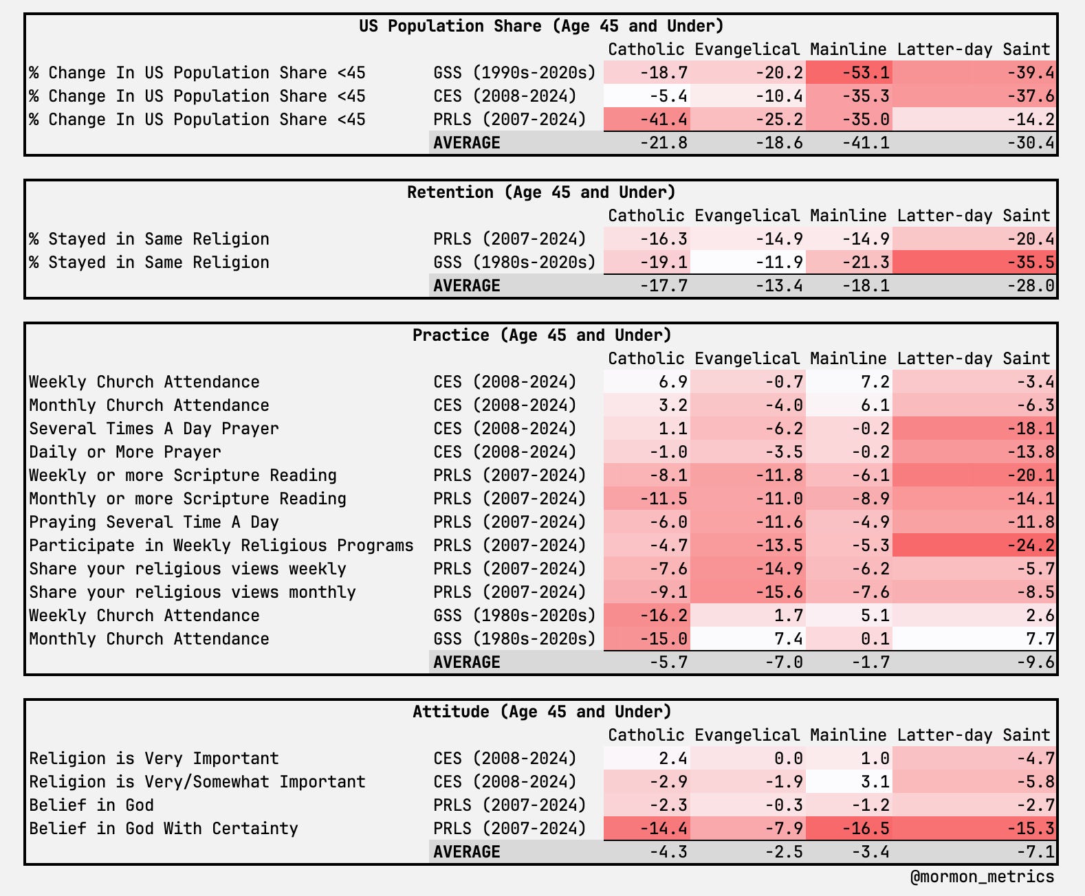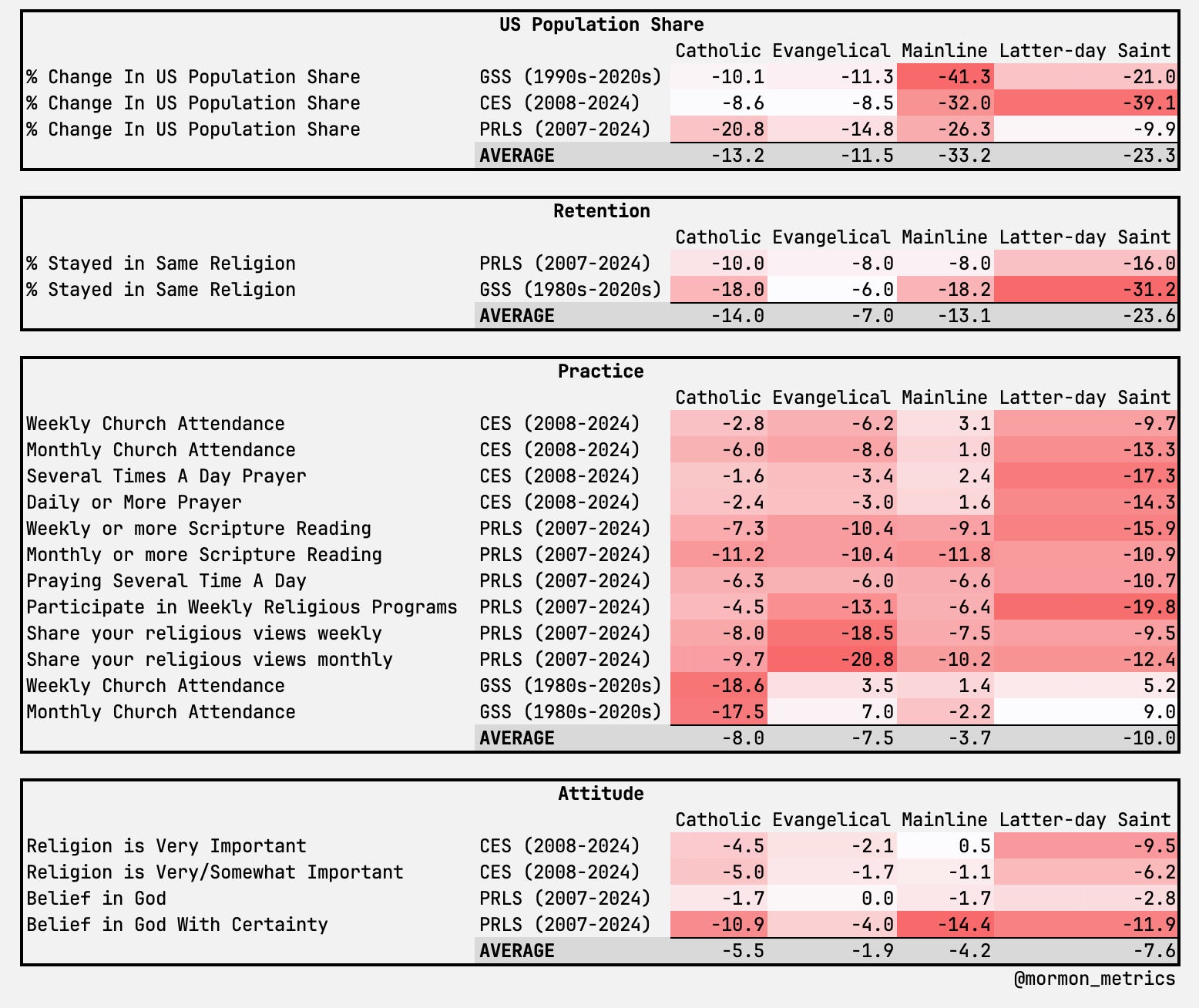 But a snapshot only tells part of the story. When you ask not just “how devout are members today” but “how has that changed over time,” some important patterns emerge. Across retention, religious practice, and religious attitudes, Latter-day Saints are declining faster than comparable Christian traditions — not just losing members at the margins, but showing steeper drops in prayer, scripture reading, and church attendance among those who still identify.