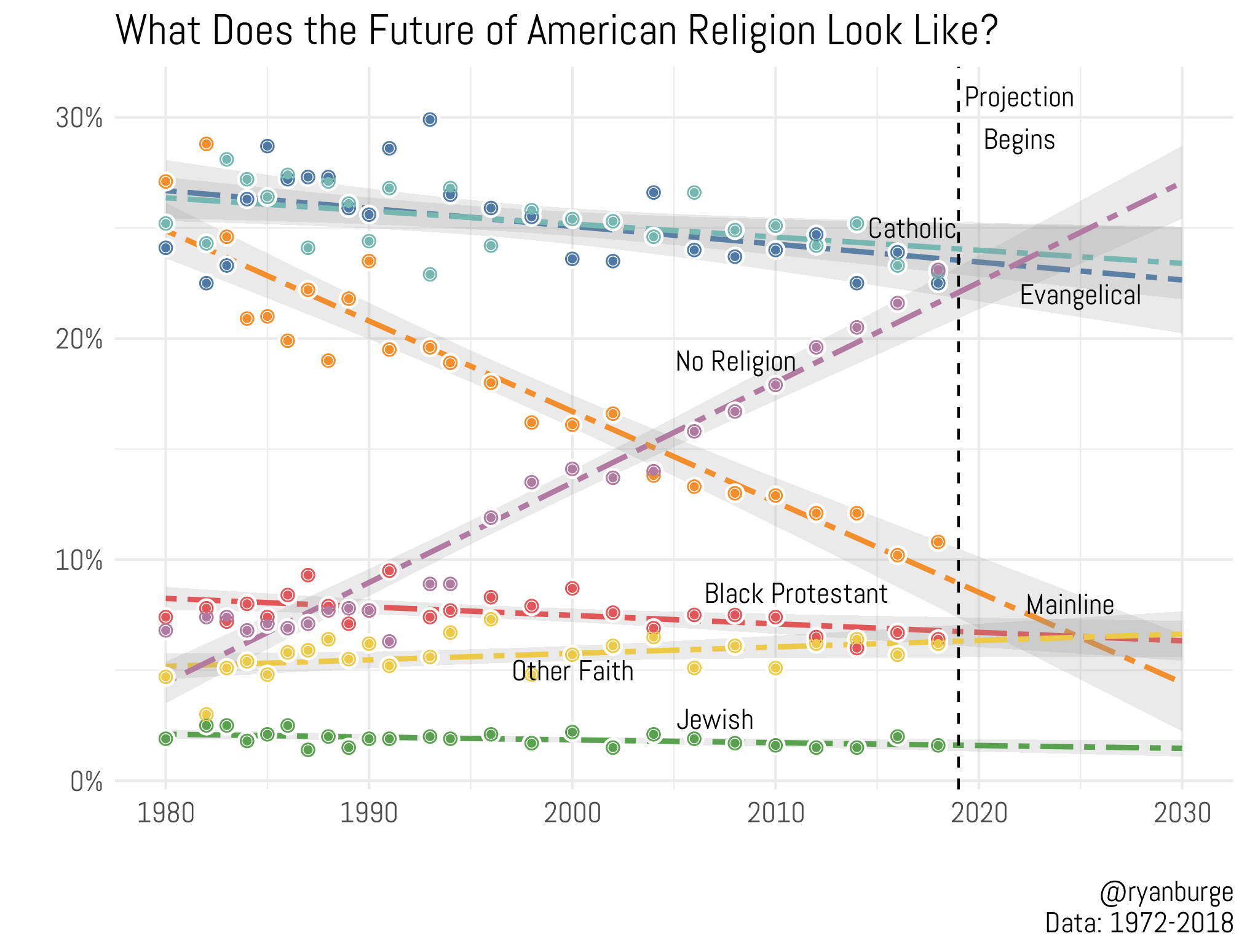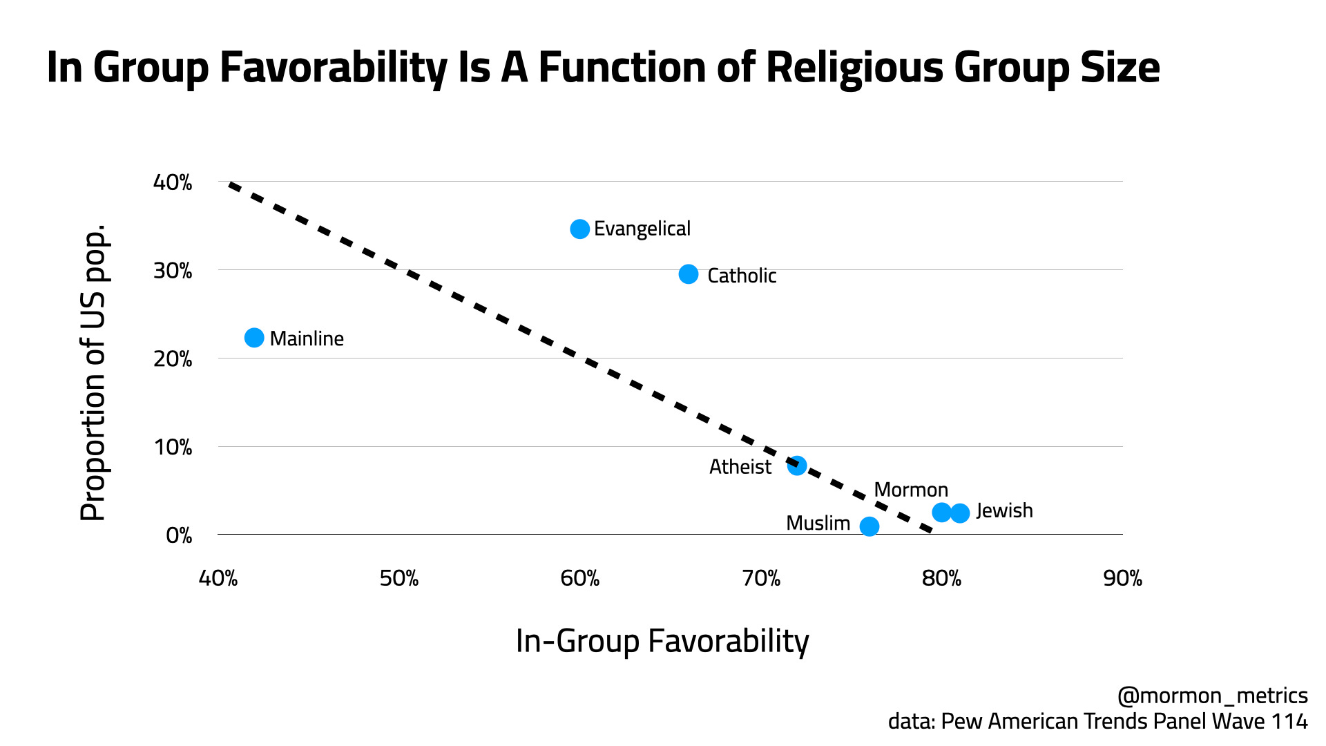 The chart is showing the rise of “No Religion“ Americans and decrease of some religions especially mainline protestants. Before, we saw mainline protestants had the lowest in-group favorability, so perhaps the two are related. In-group favorability could be indicative of the health of a religion - at least with respect to membership. Mainline Protestants have the lowest relative favorability and significantly decrease in membership in the chart above. Catholics and Evangelicals have lower in-group favorability and are decreasing in membership a little bit. Mormon, Muslim, and Jewish groups are high in-group favorability, and are flat or increasing in membership. The takeaway could be high in-group favorability doesn’t necessarily increase a religion’s membership, but lower in-group favorability is correlated with a decrease in membership over time.