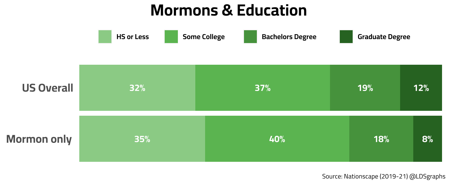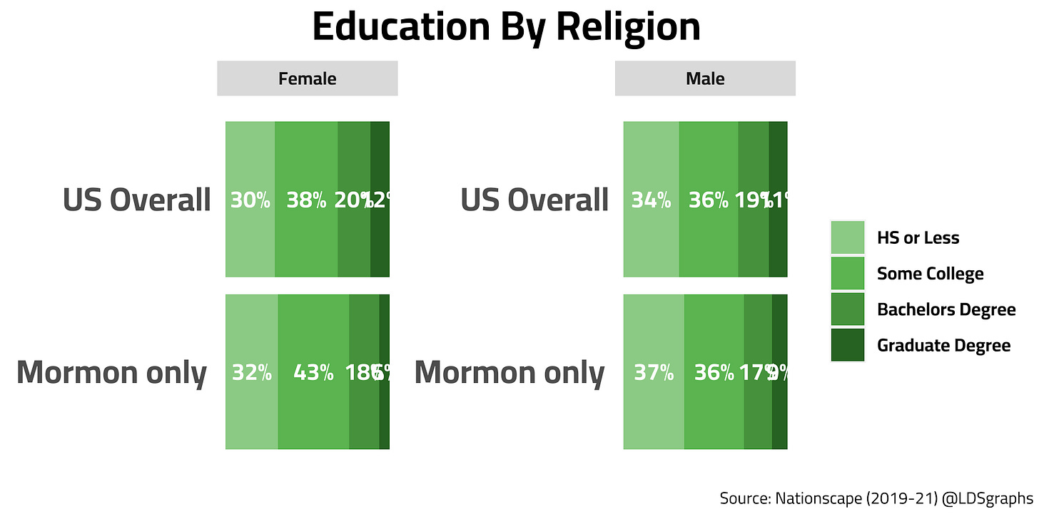 .Looking specifically at the gender cut, unsurprisingly, the "some college" group is driven by women who perhaps dropped out of college after having children. As is the trend with the national, Mormon women are a bit more likely to be educated beyond high school than Mormon men.