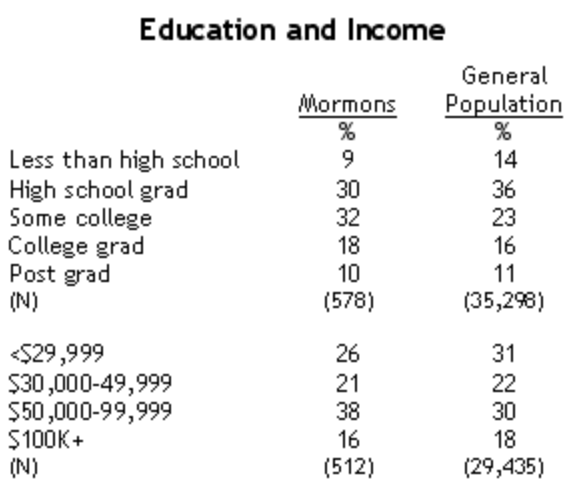 My theory is that "mormons are more educated" and "have a strong income in the middle class" were picked up in large scale in 2012 from this report and cemented in people's minds ever since.