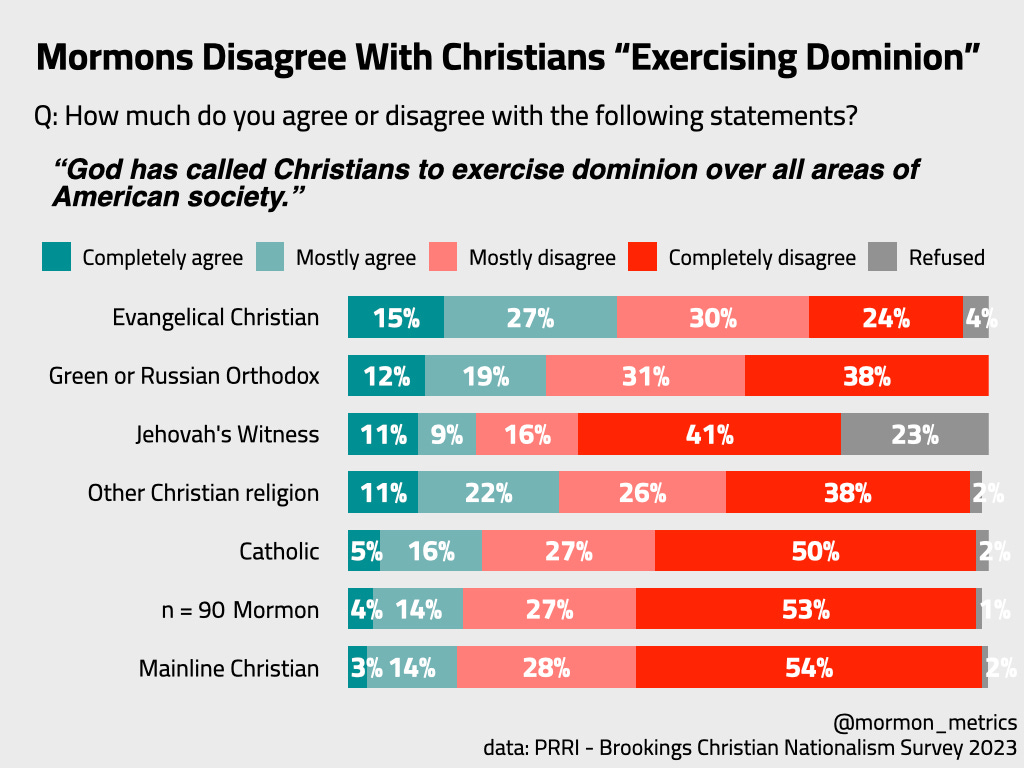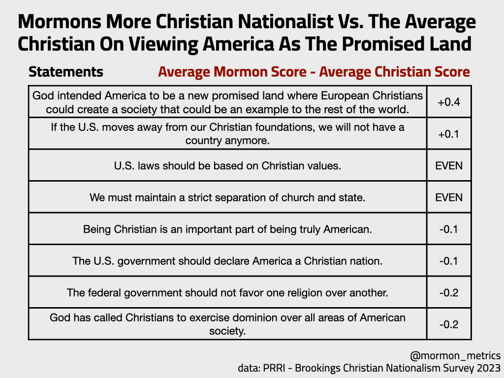 I think its important to remember that these averages are quite low. This ideology exists, but is not very prevalent. You can see this clearly in the PRRI reports only 10% of the US strongly agreeing with most of these statements and only 5% of Mormons (Mormons have many more “sympathizers“ than the US which is why they are ranked #3 among Christians).