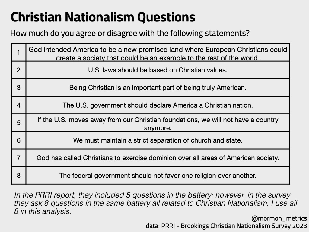 Recently, I saw a few charts around religion and Christian Nationalism. As the Mormon Metrics man, I wondered how US Mormons score on Christian Nationalism measures.