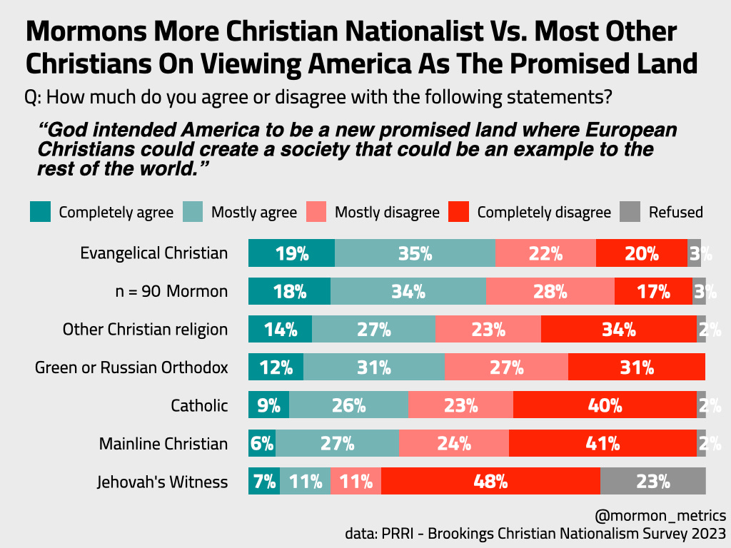 I found a publicly available survey from PRRI in 2023 with a battery of 8 or so questions measuring Christian Nationalism. There are 6000 respondents in the survey and I got 90 respondents who identify as “Mormon.“ You can read their full write-up here which was published about 2 years ago at this point. Its really interesting!