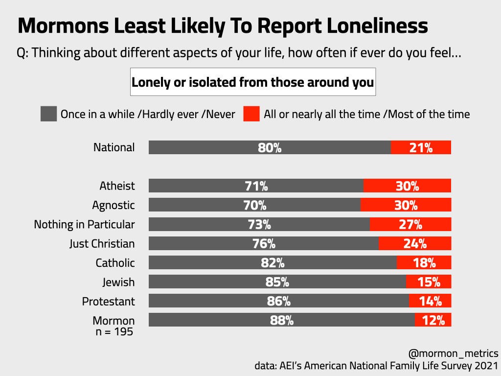 Mormons are actually the least likely to report feeling lonely frequently - half as much as the national average.
