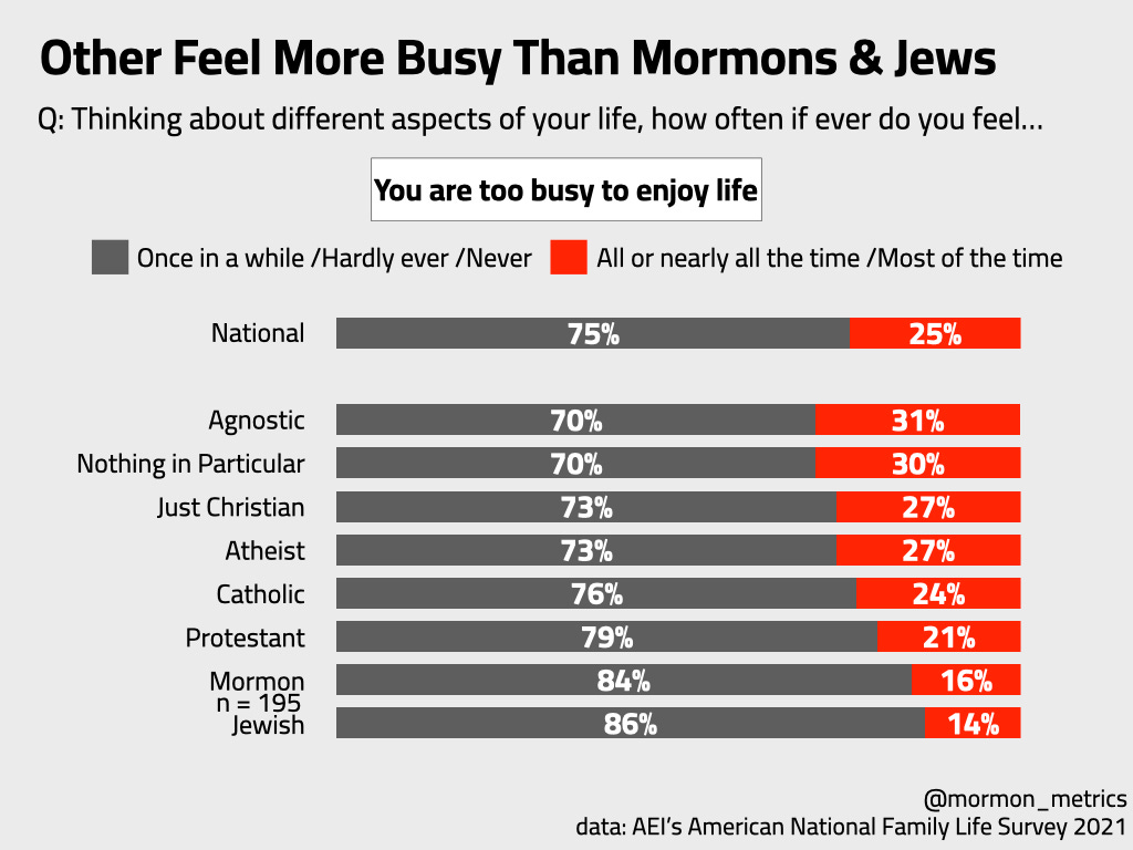 There were a few other relevant questions on the survey to this topic. My initial thought was perhaps Mormons with large families may feel “too busy to enjoy life“ compared with other groups, but they self-reported otherwise.