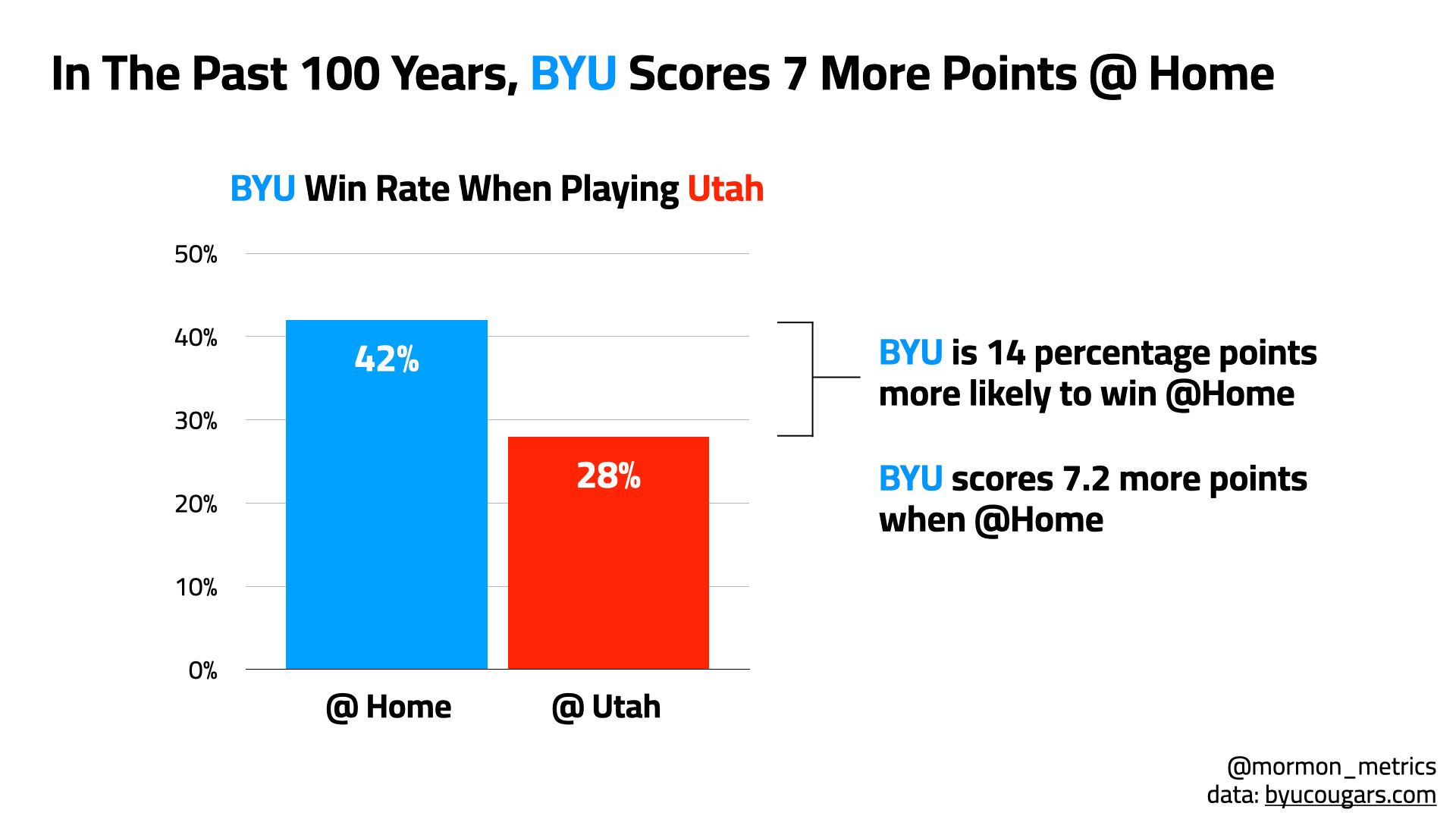 The answer to this question is simple: YES! BYU has won 14 percentage points more of games when @ home. On average, they have scored one touchdown + extra point (7 points) more @ home compared to @ Utah. So, yes they have a home team advantage which will make the upcoming game more interesting since it is @ Utah.