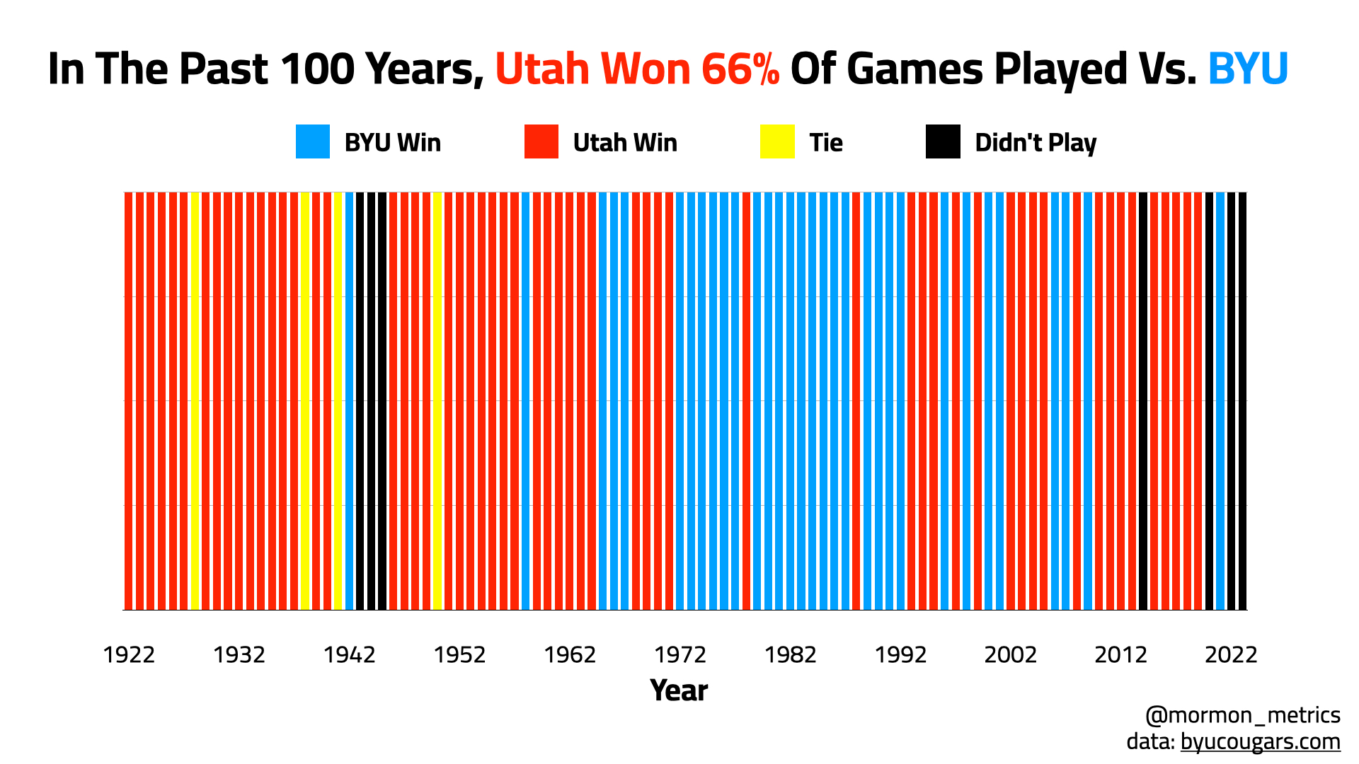 Our first chart is a timeline over the last 100 years. Red is a Utah win and Blue is a BYU win. You will also notice there are tie games early on (in yellow) and years where the teams didn’t play each other (in black).
