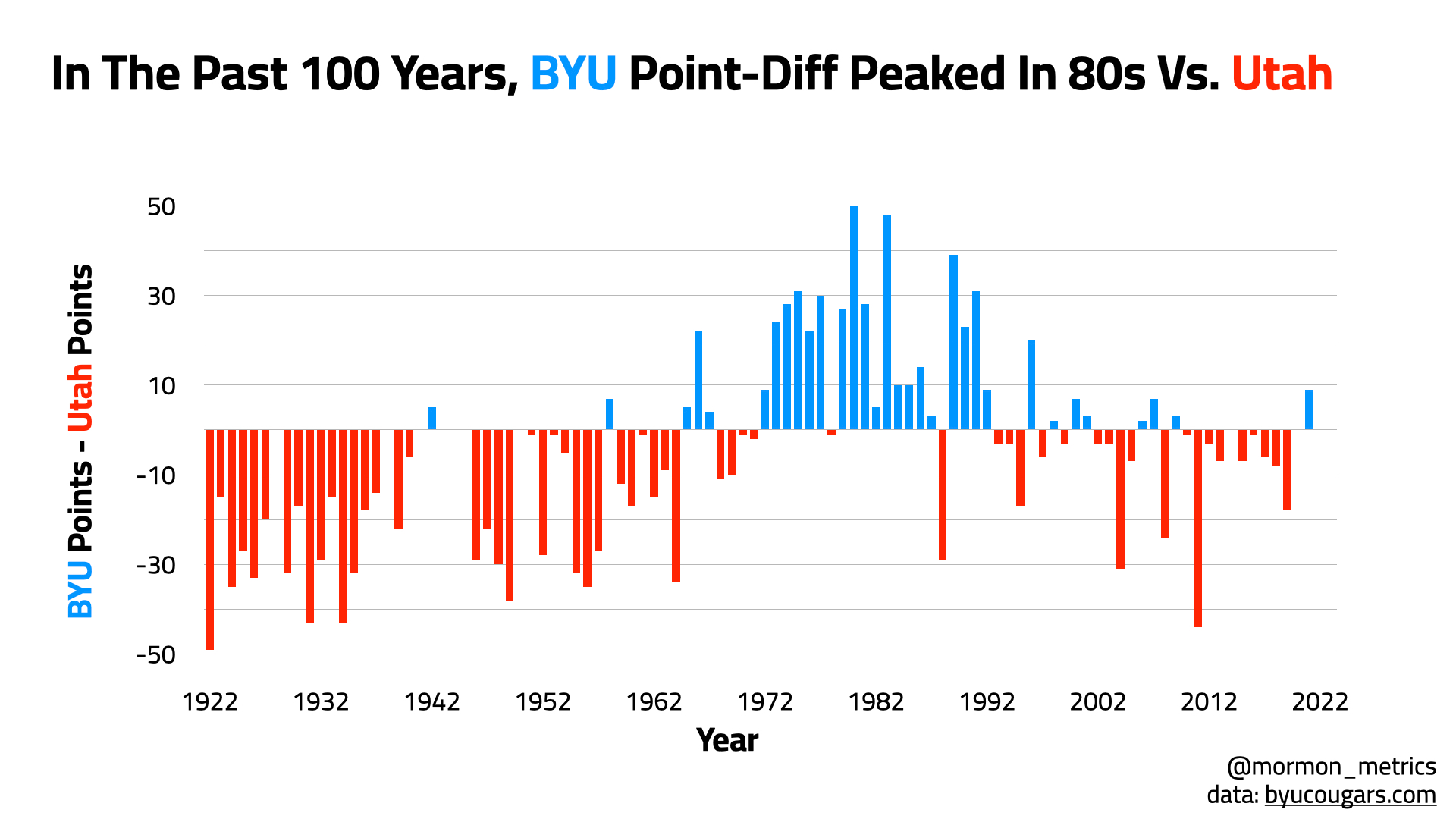 On the bright side for BYU, the last few years haven’t seen as stark of point differentials - Utah only winning by a few points the last several games. Much more evenly matched compared to the period before 1970 😂.