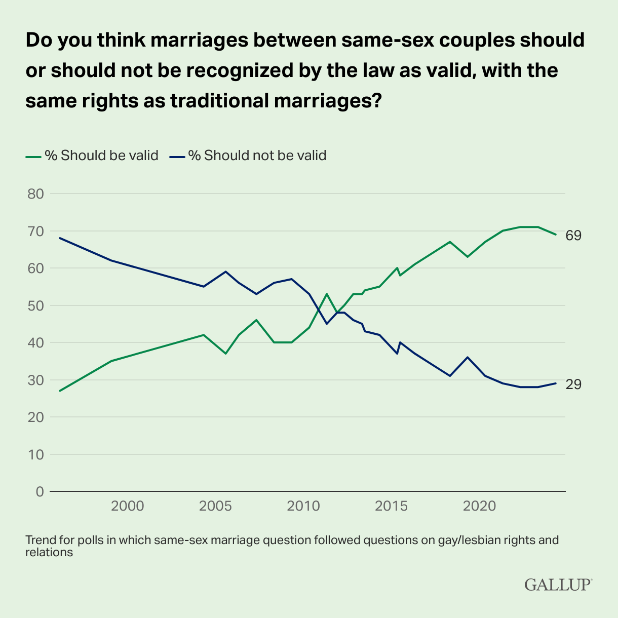 As you can see in the last 20 or so years, we can see the switch in the US national numbers. Most people now support same sex marriage 70/30 whereas going back a few years it was 70/30 opposing.