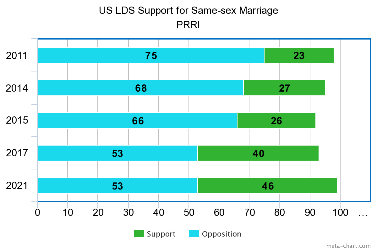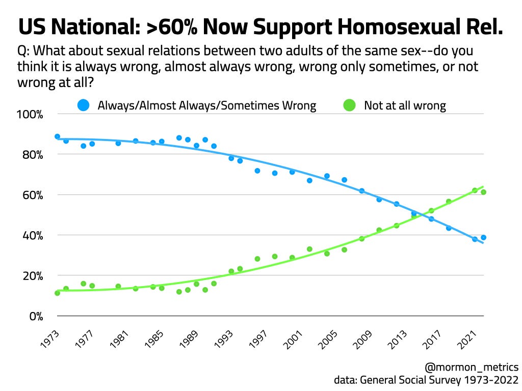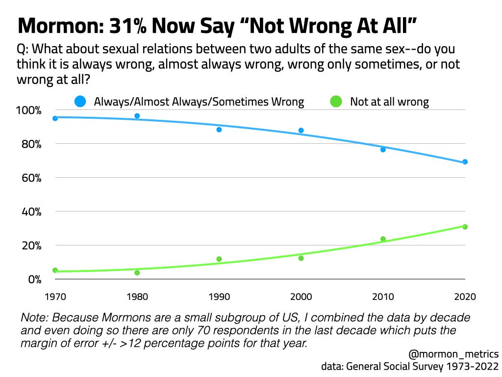The church has a gospel topic essay on “same sex attraction“ saying that while it is not a sin to identify as “gay, lesbian, or bisexual,“ homosexual relations “violate“ God’s laws. Historically, Mormons are heavily influenced by the Church’s positions on social issues and often align with them. But for this issue, recently, I’ve seen some evidence of deviation.