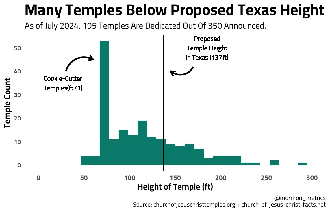 The original proposed height for the Temple in Texas falls somewhat in the middle of the height distribution of all dedicated temples, but on the higher end (71st percentile to be exact). It seems like it could be reasonable downsized and not look weird when lined up against other temples.