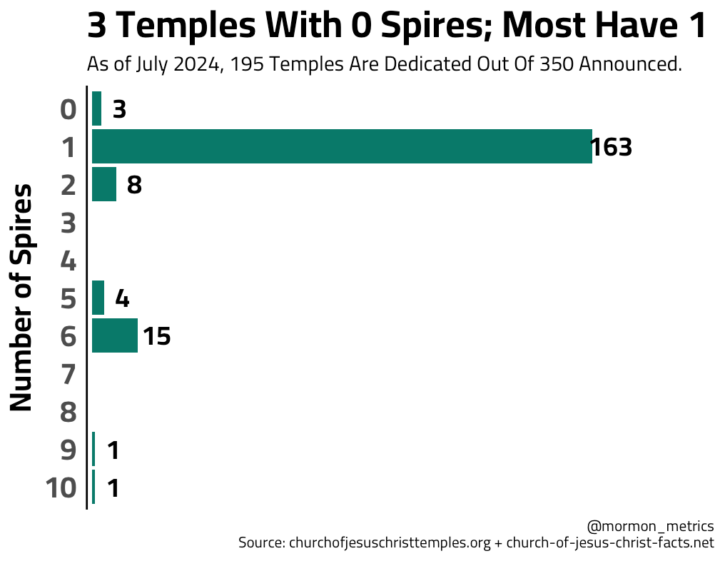 I think these two questions are inherently connected; Angel Moroni is typically on a steeple! We can see that almost all of temples have steeples (most having exactly 1), but 3 temples have no steeples.