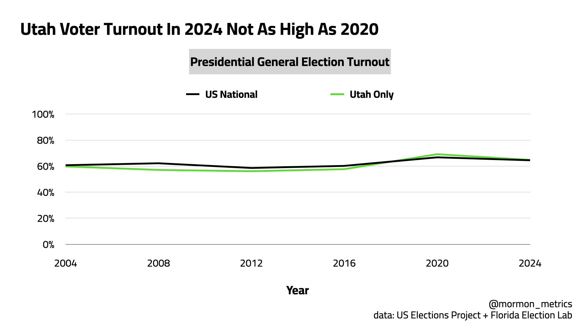 It looks like from 2020 turnout has decreased both in Utah and nationally. National turnout decrease makes sense as fewer places have vote-by-mail options in 2024 compared with covid 2020, but I’m not sure why Utah voter turnout decreased.