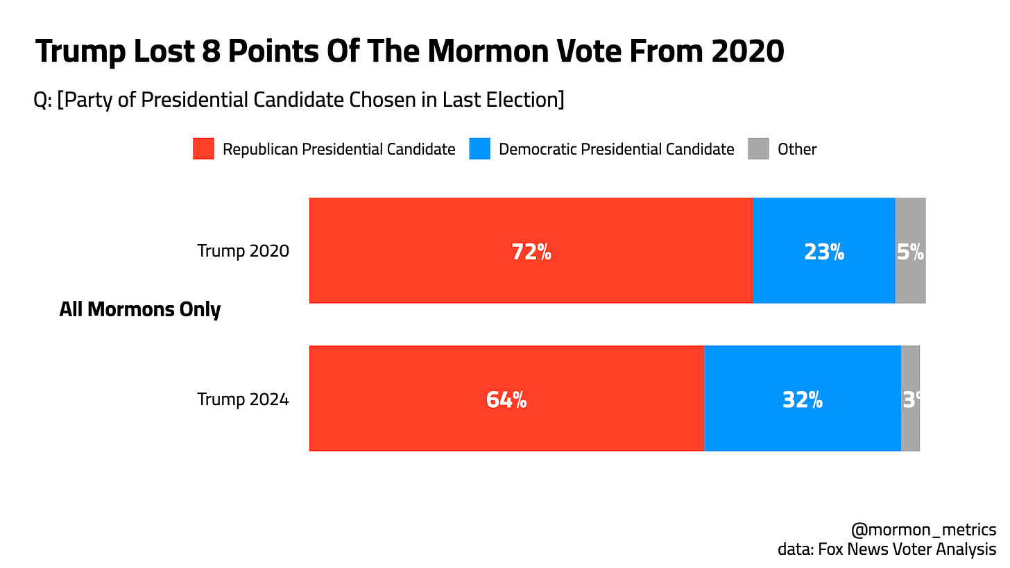 However, when we look at how the overall Mormon vote changed, we see a gap. Note, this isn’t from Romney to Trump like a previous post, this is from Trump 2020 to Trump 2024