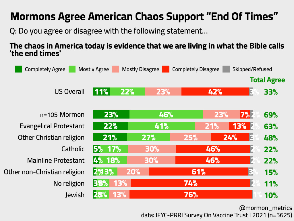 In this chart we see that Mormons are the most likely group to believe that the recent “American Chaos” is evidence that we are living in the end of times. 70% of Mormons agree with this vs. only 33% of the population. A gigantic gap - even among some other christian religious groups.