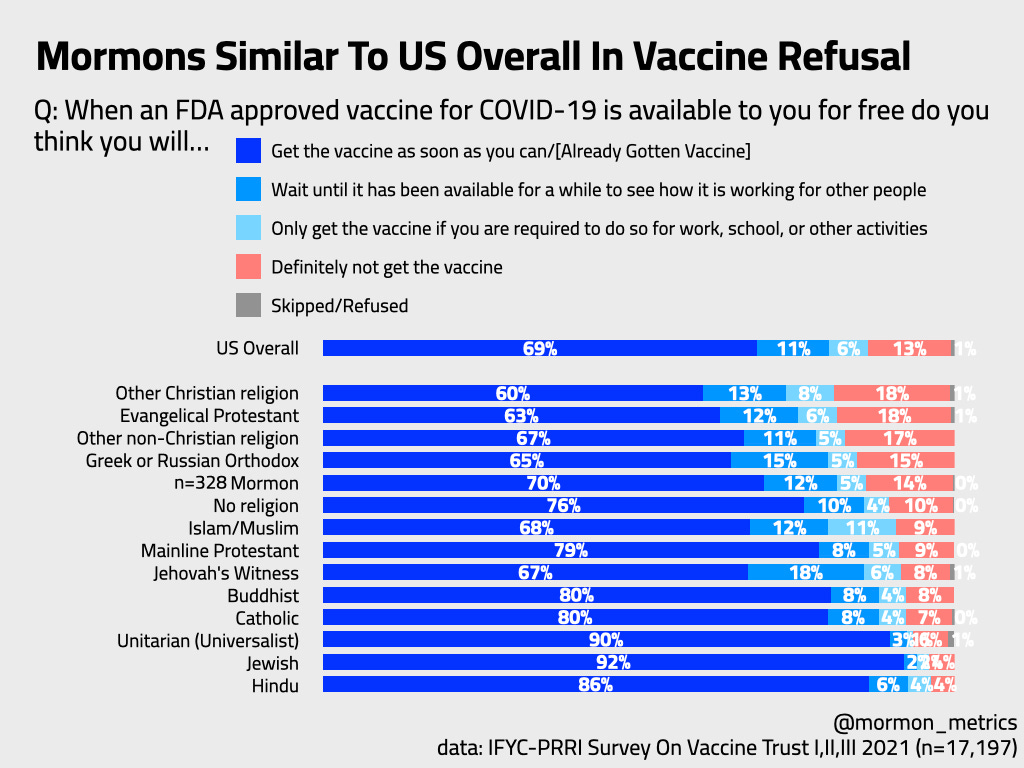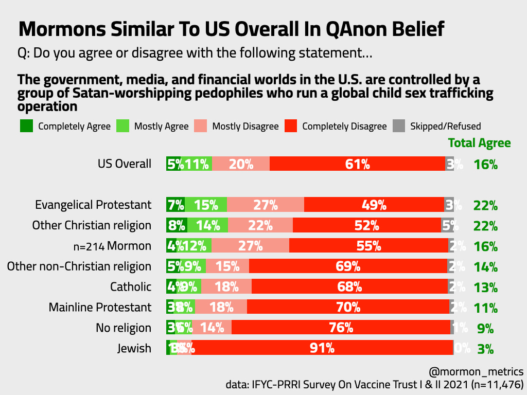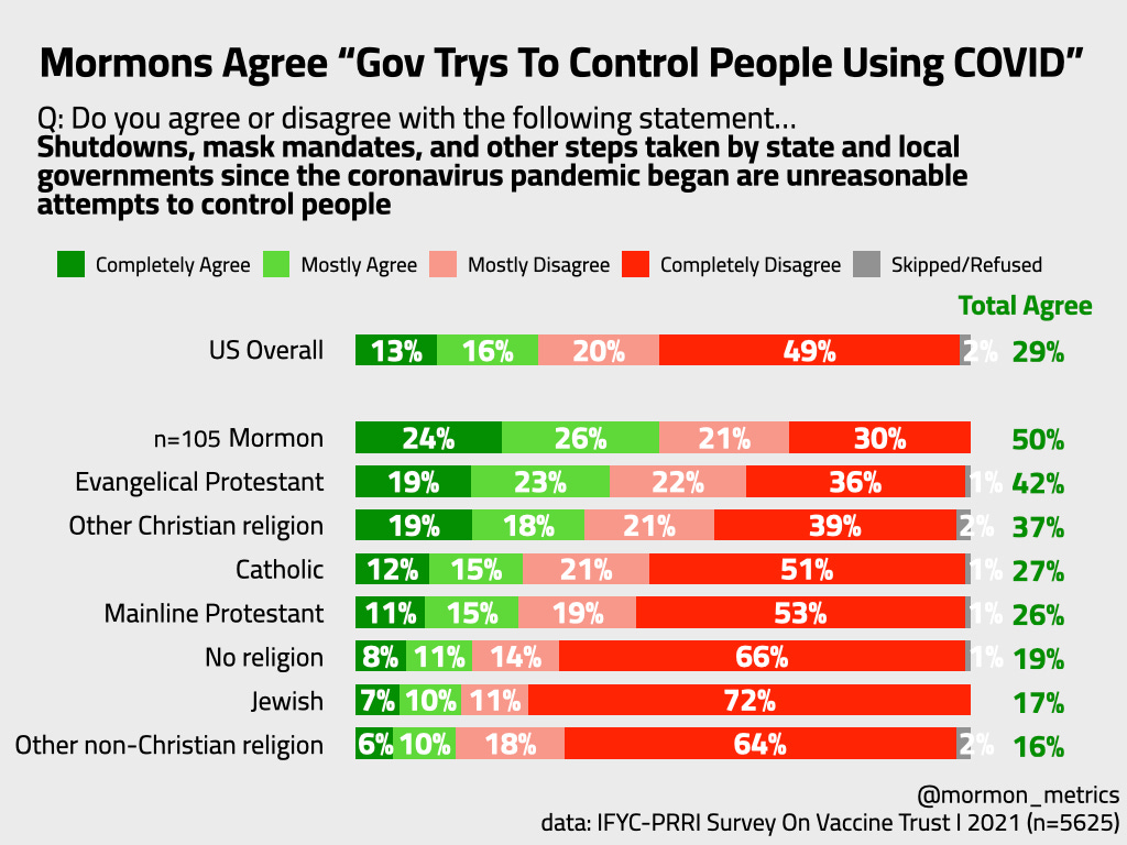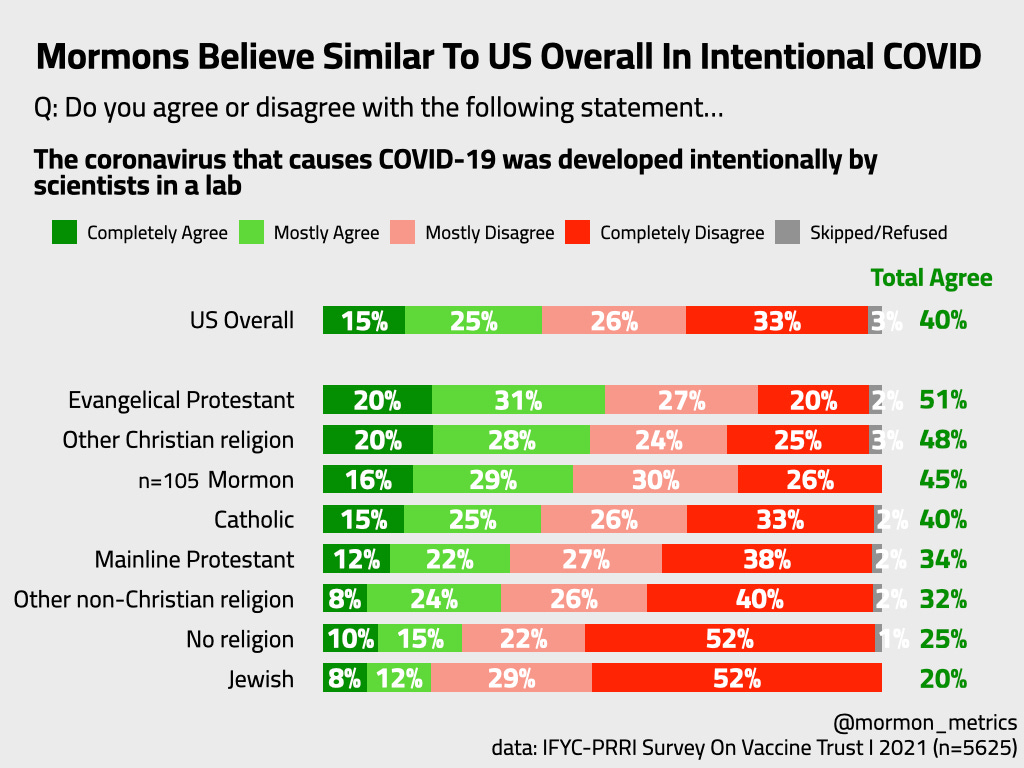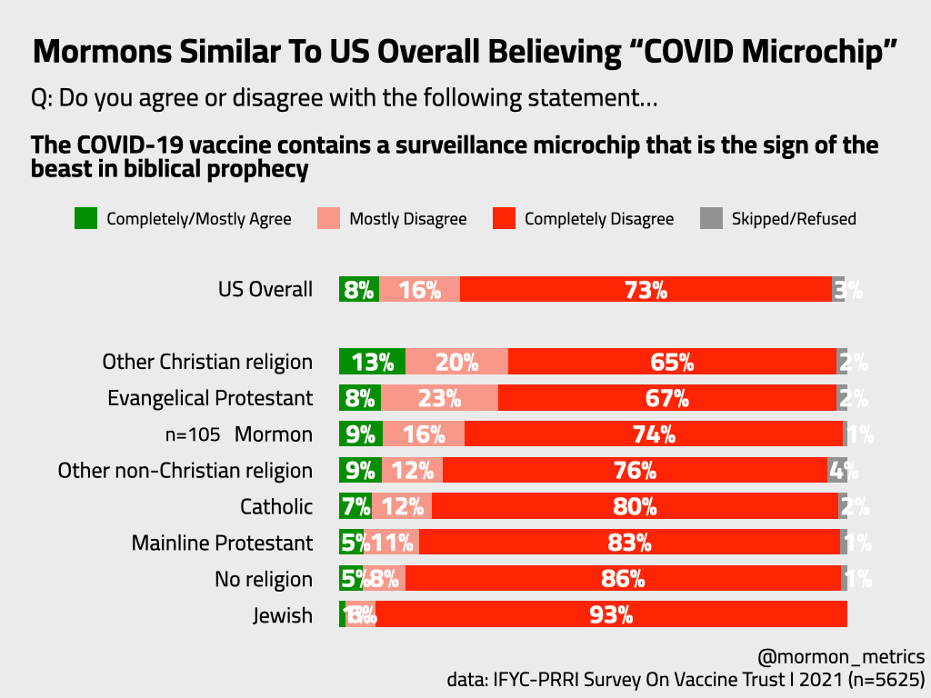 Mormons are about as likely as the US population overall to believe in the QAnon conspiracy, “COVID was created intentionally”, and “covid is actually a government surveillance microchip”. Just like Mormons were about as likely to refuse the vaccine as the US overall population.