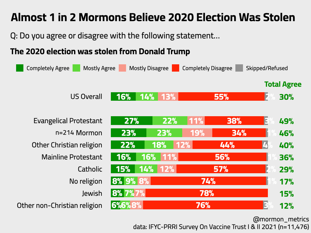 Nearly half of Mormons agreed the 2020 election was stolen - 16 points higher than the U.S. average, and close to Evangelicals.. To me, that at face value is a crazy stat. Though Evangelicals are higher, 1 in 2 Mormons believing in a stolen election in 2020 is something I would have never guessed to see 5 or 10 years prior to this survey.