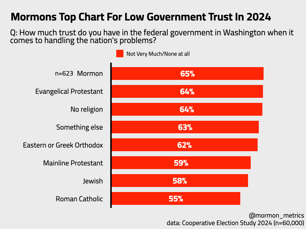 TL;DR Nearly 1 in 2 Mormons believed the 2020 election was stolen — far more than the general public. But unlike other religious conservatives, Mormons don’t show elevated belief in other conspiracy theories. Why? I argue this reflects not conspiratorial thinking, but deep distrust in American government — a distrust rooted in history, theology, and recent events.