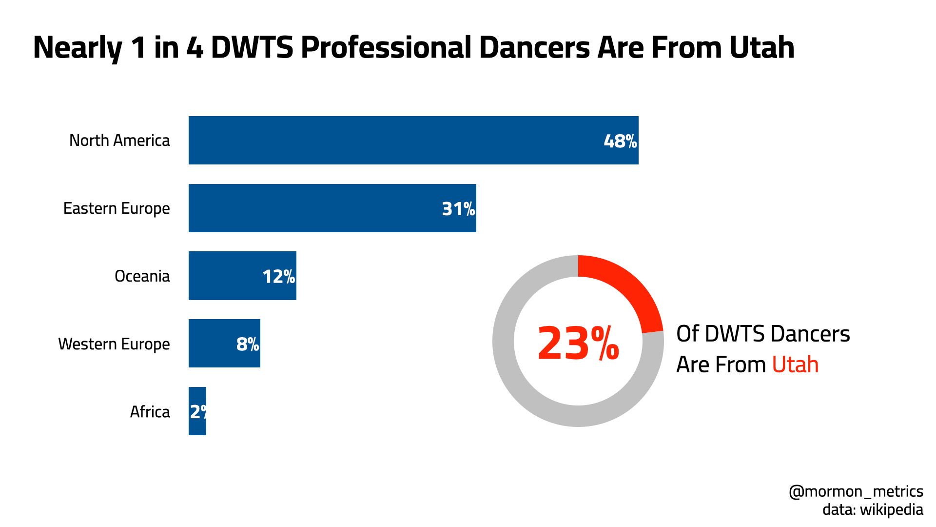 First, let’s look at profiles of the professional dancers on Dancing with the Stars. There are plenty of other places professionals dance, but let’s specifically look at the show in honor of the finale. To date, there have been 52 professional dancers - 12 of which are from Utah (23%). The next closest state was California with only 3 dancers. Nearly 1 in 4 for Utah is strong representation.