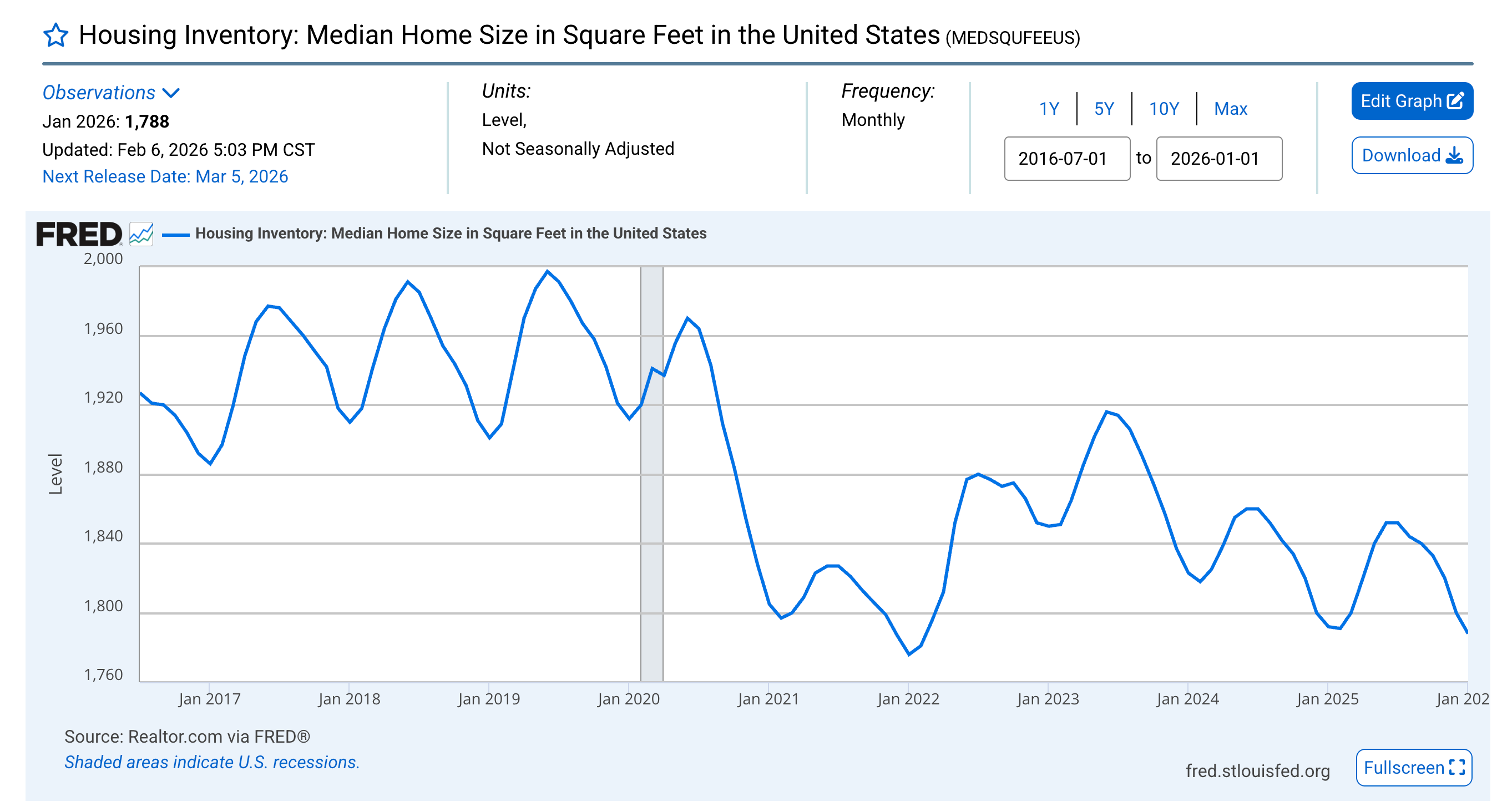 So now that we found what I think is the data, I tried to verify their finding with another source and more recent data. The Federal Reserve Bank of St. Louis keeps a lot of great national datasets including one on house listings from Realtor.com. I pulled the median house sqft size from February 2025 to January 2026 and plotted the data below.1