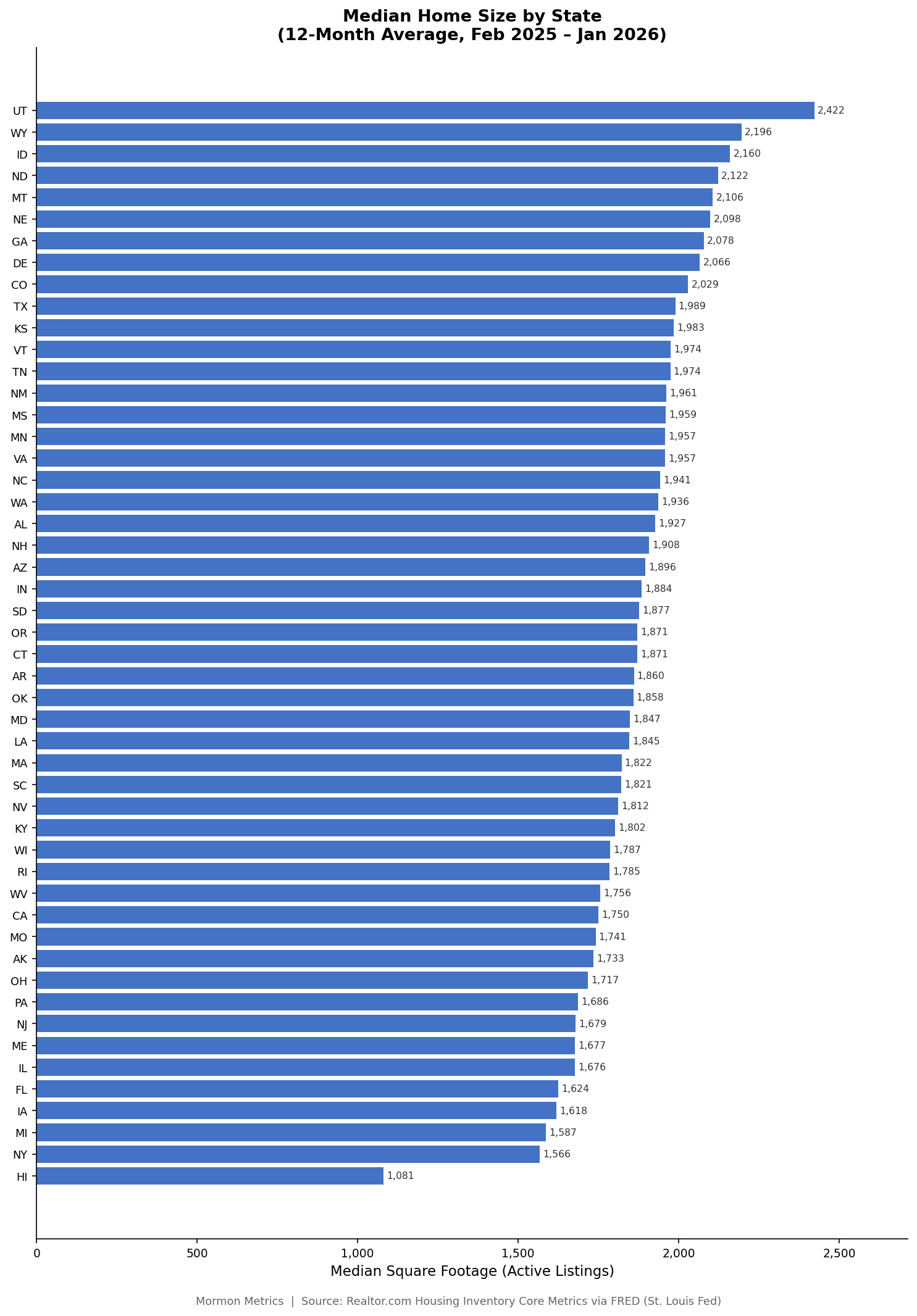 One caveat I will mention is a possible new building bias. Utah has been building out a lot of places with brand new developments. I believe the average new home today is much bigger than it was 50 years ago. Other more populated and dense states simply may have more existing housing and may not have as much room to build things out. It wouldn’t surprise me if Utah had a higher proportion of brand new house listings compared to other states. I haven’t confirmed this theory with data, just my own theory to add to the list above i guess.