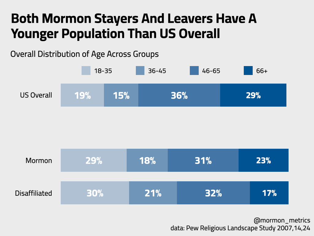 We see that in general Mormons and Disaffiliated Mormons have an age distribution that looks pretty similar to each other. Mormons are slightly older than Disaffiliated Mormons, but when compared to the US overall population, both groups look young.