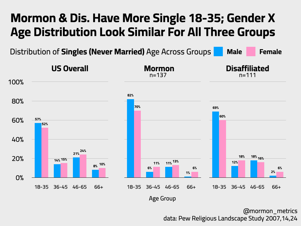 Honestly, what I am seeing here confirms that there isn’t a gender difference between single Mormons and single Disaffiliated Mormons. Besides there being just more young people among Mormons and Disaffiliated (like we previously observed), the gender breakdowns look the same across age between all 3 groups!