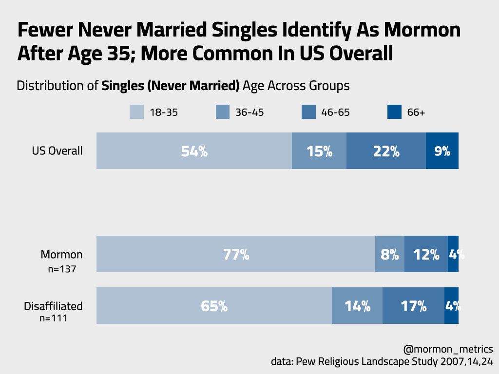 This data raises an interesting question… Why do single men attend less church as they age yet still keep their “Mormon“ identity? Very open to other’s theories on this.