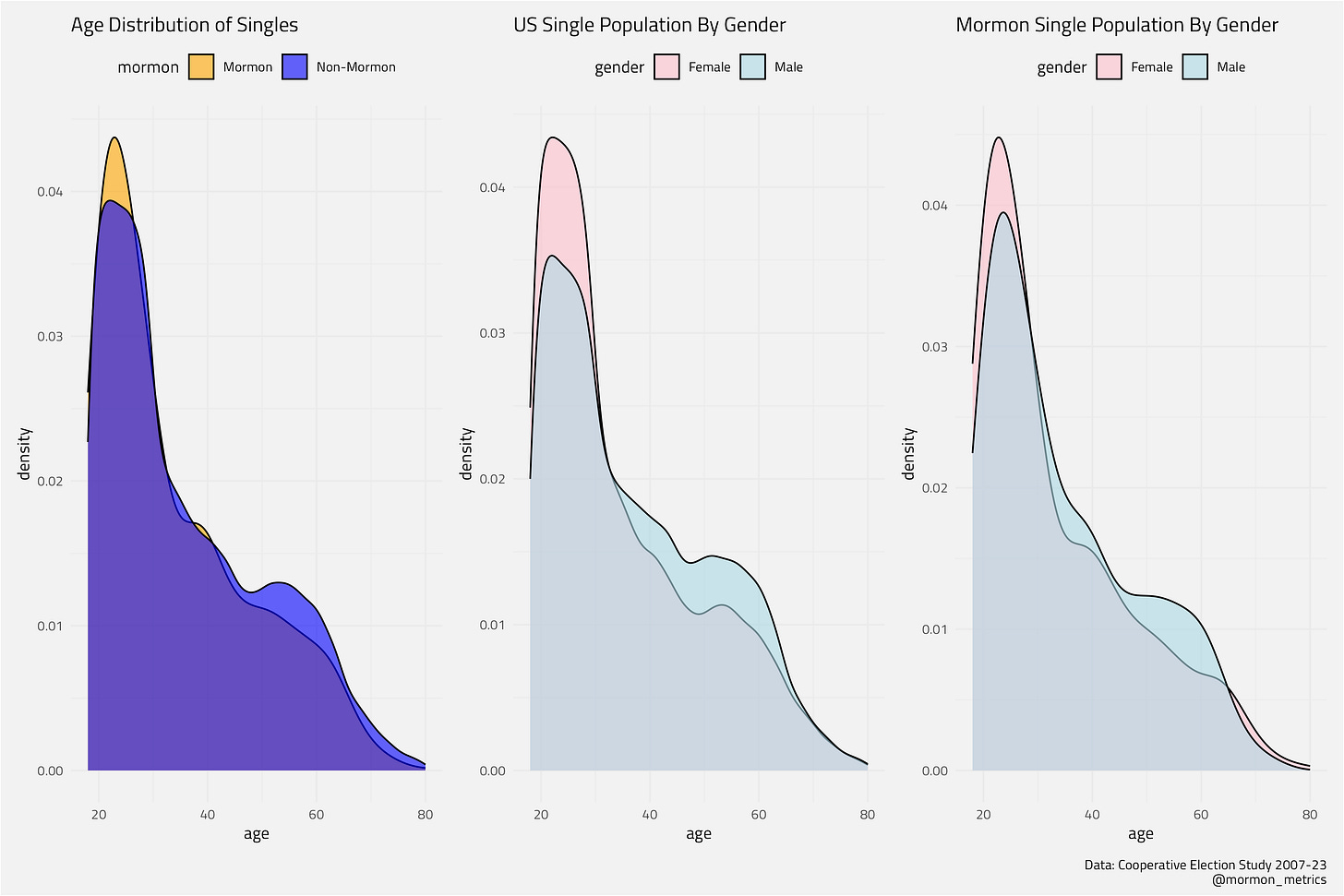 Analyzing these density plots from the CES (mormon single n > 700), men seem to be more prevalent than women after age 35 in the US overall and the Mormon population.