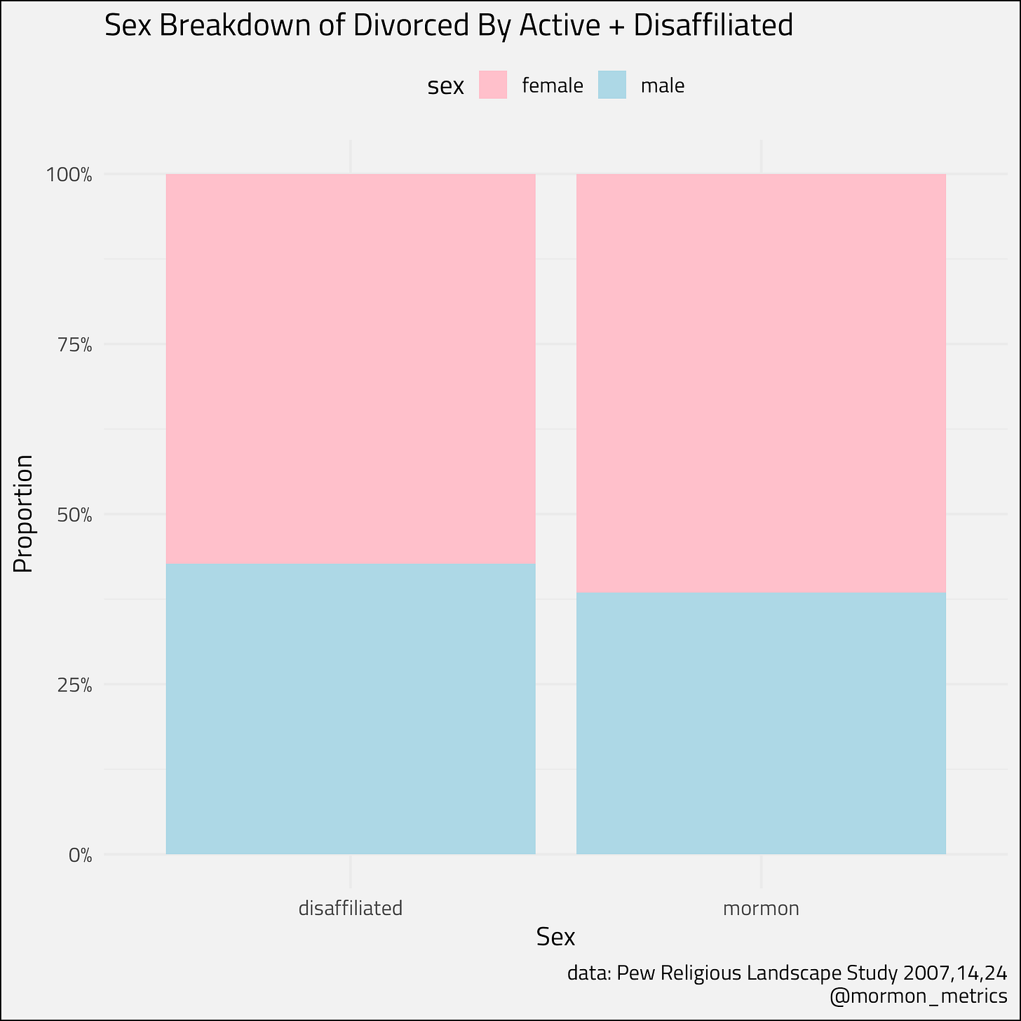 Now let’s look at this by gender. If the theory is correct, we should see big differences in the gender distribution of Mormon vs. Disaffiliated.