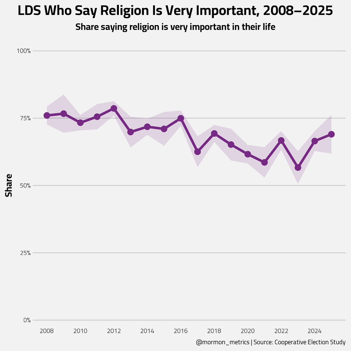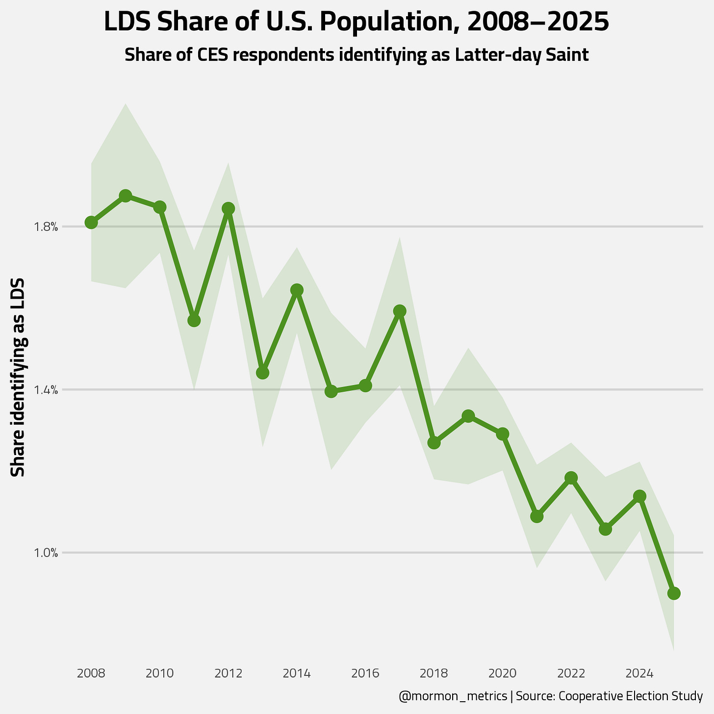 And that’s the catch. In 2025, LDS make up 0.9% of the population representing the lowest recorded on this survey.