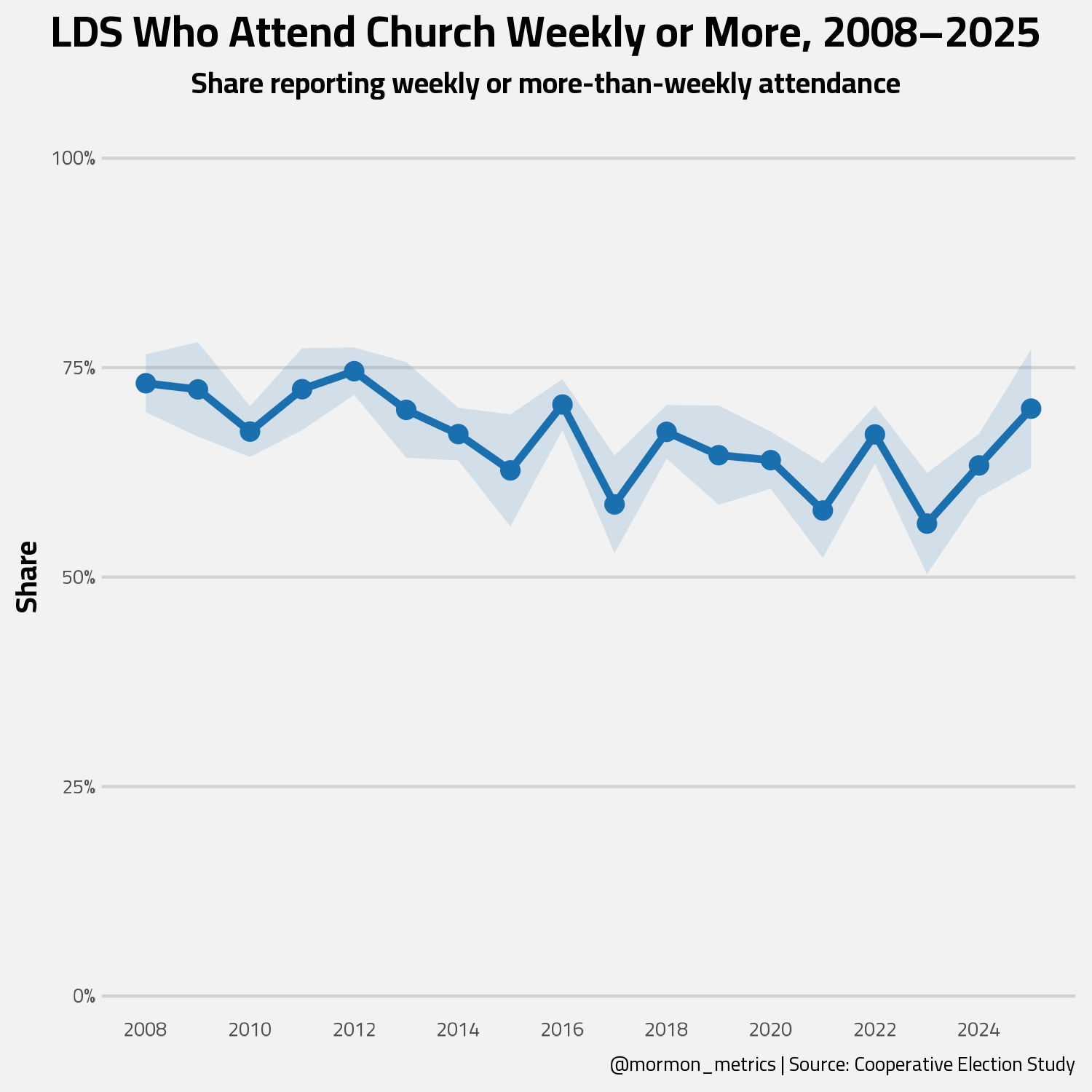 Looking at these charts, perhaps a religious resurgence among LDS is happening! All the metrics are going up. I will note that of the 17000 respondents in the 2025 off year, there are only 161 LDS respondents which is the lowest number we’ve had in a CES study (looking from 2008-2025).