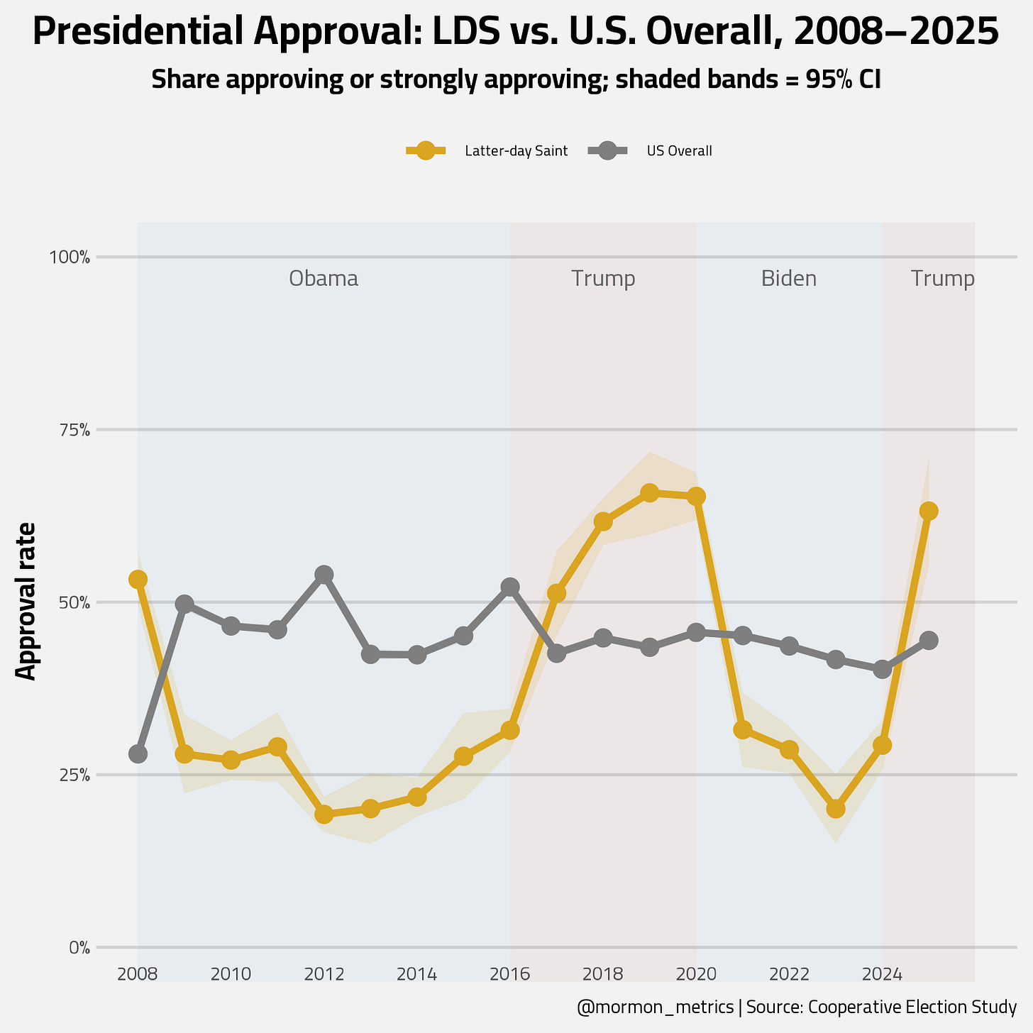 The most interesting thing to me about this chart is the visual warm up LDS had to Trump from 2017 to 2020. They were clearly initially resistant to him, but warmed up quickly afterwards. In 2025, we can still see strong levels of LDS approval for Trump near in line with his approval in 2020.