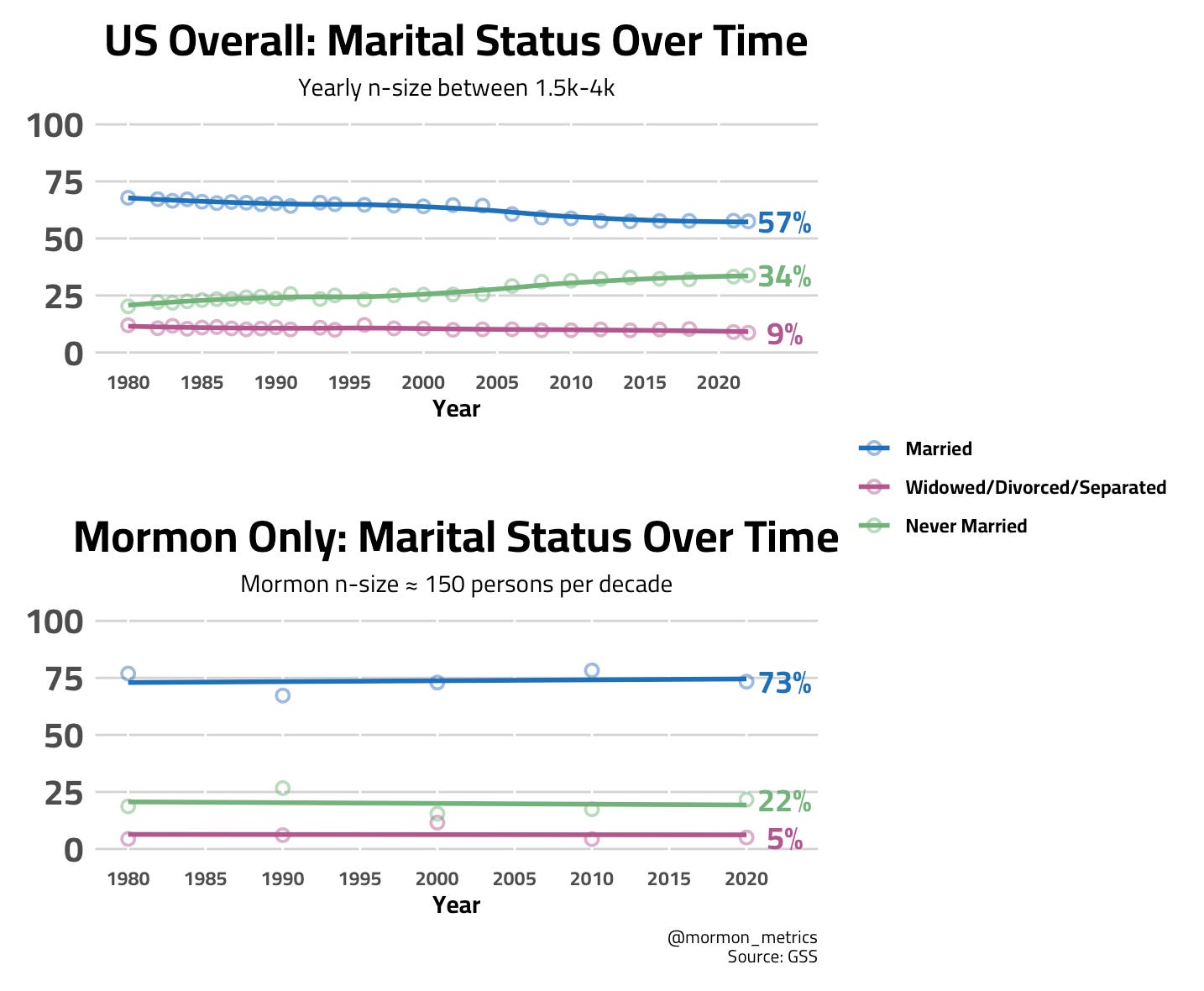 Compared to the US population, Mormons are more likely to be married (especially more recently) and less likely to be "never married" or "widowed/divorced/separated."