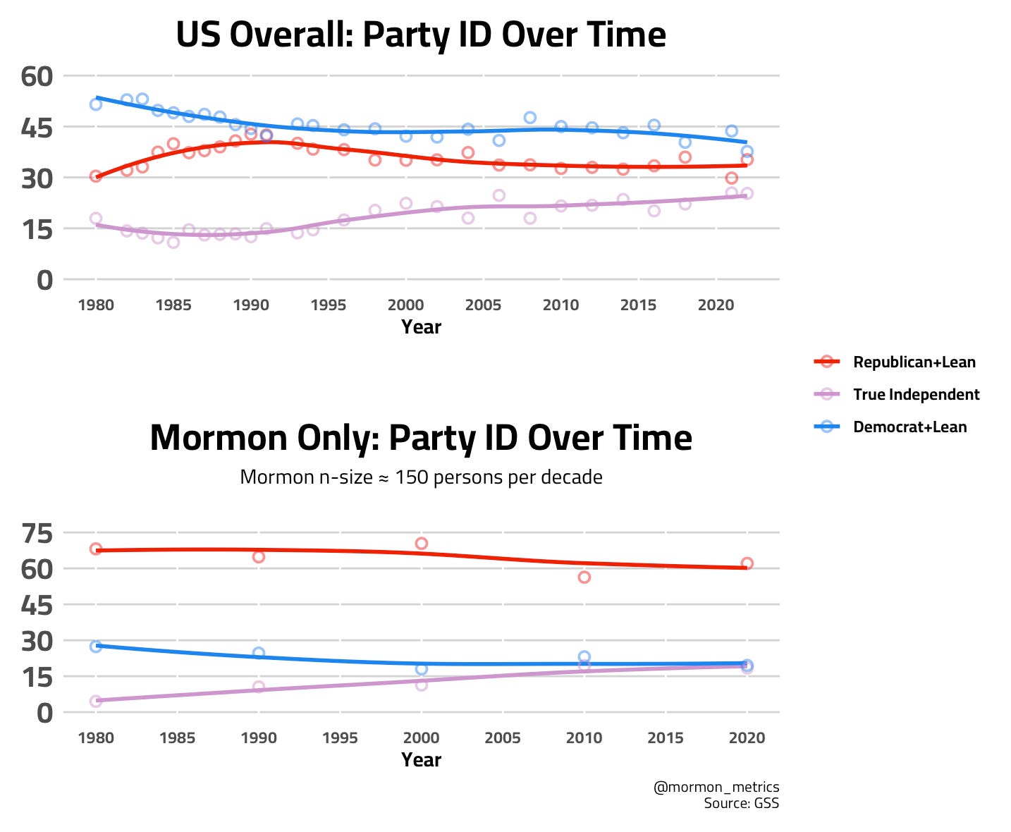 Recently, a few articles have come out about how Mormons are less favorable toward Donald Trump than previous Republican candidates. Specifically, they say the distaste still lingers here in 2024 and younger Mormons may be moving away more quickly than other younger folks. While we won't dive into the age X party affiliation breakdown given our limited sample size with the GSS, let's look at some overall trends.