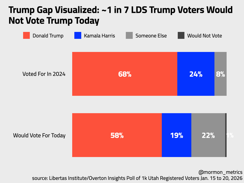 If asked today whether Latter-day Saints would vote for Trump again if an election were held today, 58% said they would. However, this is compared to 68% of Latter-day Saints that voted for him in 2024.