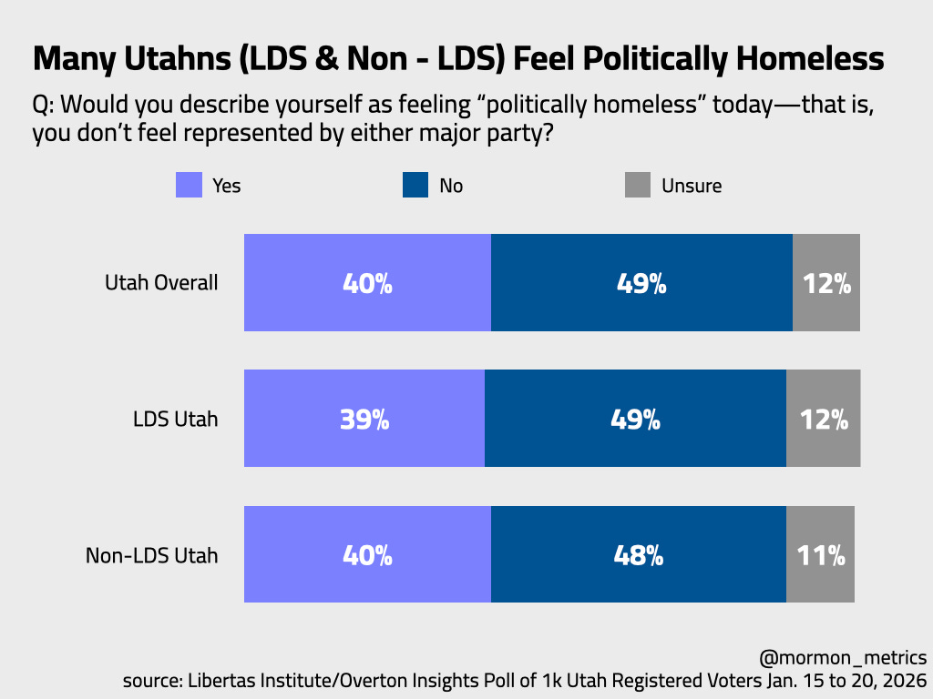 In the news, we hear about the “politically homeless” latter-day saints, but from this chart we can see that Latter-day Saints aren’t the only ones who feel this way. In fact, statistically non-LDS Utahns feel this way in the same numbers!