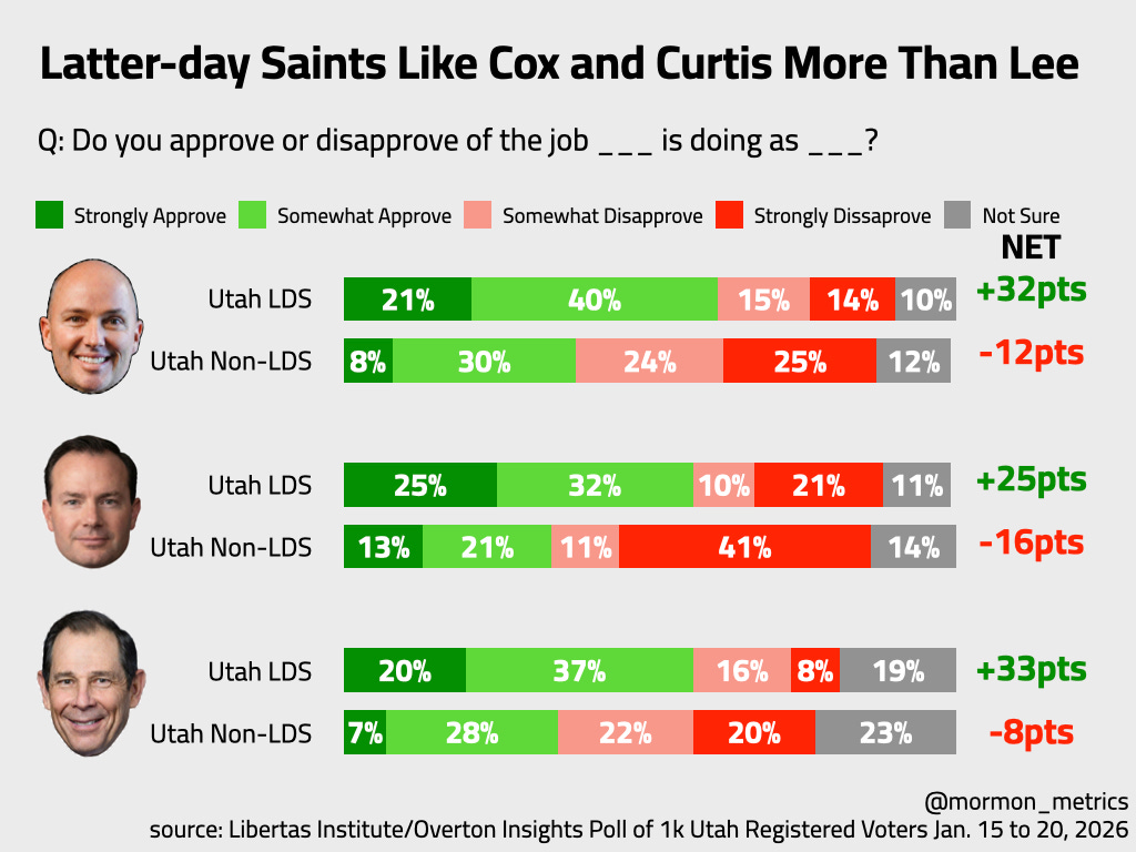 Interestingly, the counter culture opposes one Latter-day Saint politician more than the others. And yes, it’s Mike Lee. A whopping 41% of non-LDS “Strongly Disapprove” of him. Interestingly, Mike Lee has the most Strong Approvers from the Latter-day Saint crowd at 25%, yet also the most Strong Disapprovers among Latter-day Saints (21%).