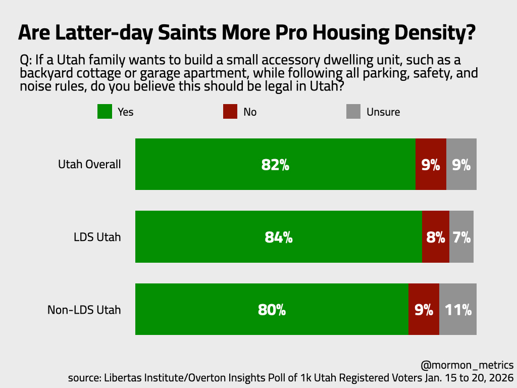 I think it's a big stretch to conclude LDS-Utah, or even Utah in general is breaking the NIMBY mould just because slightly more than 80% people are okay with their neighbours building a backyard or garage suite. That's probably one of the smallest increases in density a single family home lot could undergo. That's potentially not even one additional family worth of space (it does say small, so I'm assuming the question, and those answering it, are picturing something for 1-2 people, maybe 3 at most if it's a couple with a kid that's still small before they go elsewhere). I would be far more surprised if the same results occured and the question asked something like "If a property owner in your neighborhood demolished the house on it and replaced it with a four-unit row house with four secondary suits (8 units total), taking care to follow all building, safety, and noise laws, would this be okay?" I think the results would be much different. I used an 8-unit example as I'm told this is one of the most common types of "missing middle" housing needed by many cities in NA having the density conversation.
