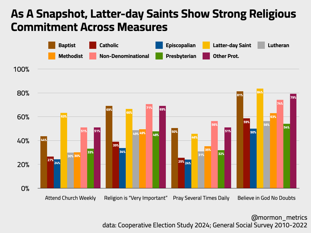 As a snapshot in 2024, Latter-day Saints show strong resiliency to secular headwinds with high scores on metrics across belief and devotion compared to most other christian traditions.