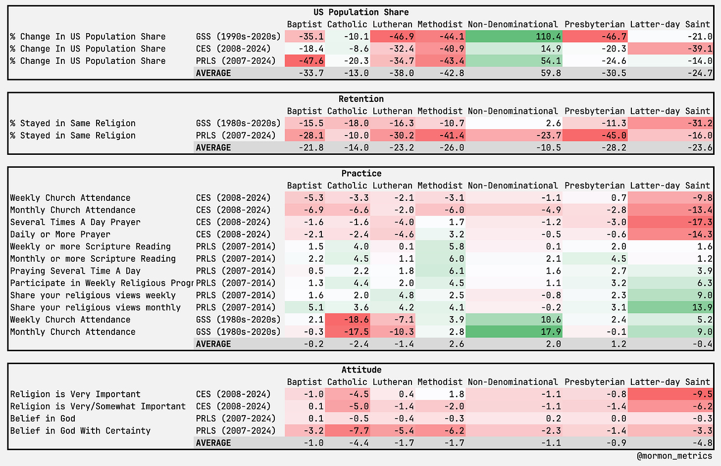 Our previous main takeaway was that when looking at the largest Christians Traditions in the US, while the snapshot in 2024 shows Latter-day Saints resistance to secular headwinds, looking at a trend most metrics across practice and belief (but, mostly practice) are declining faster. Read the full post below: