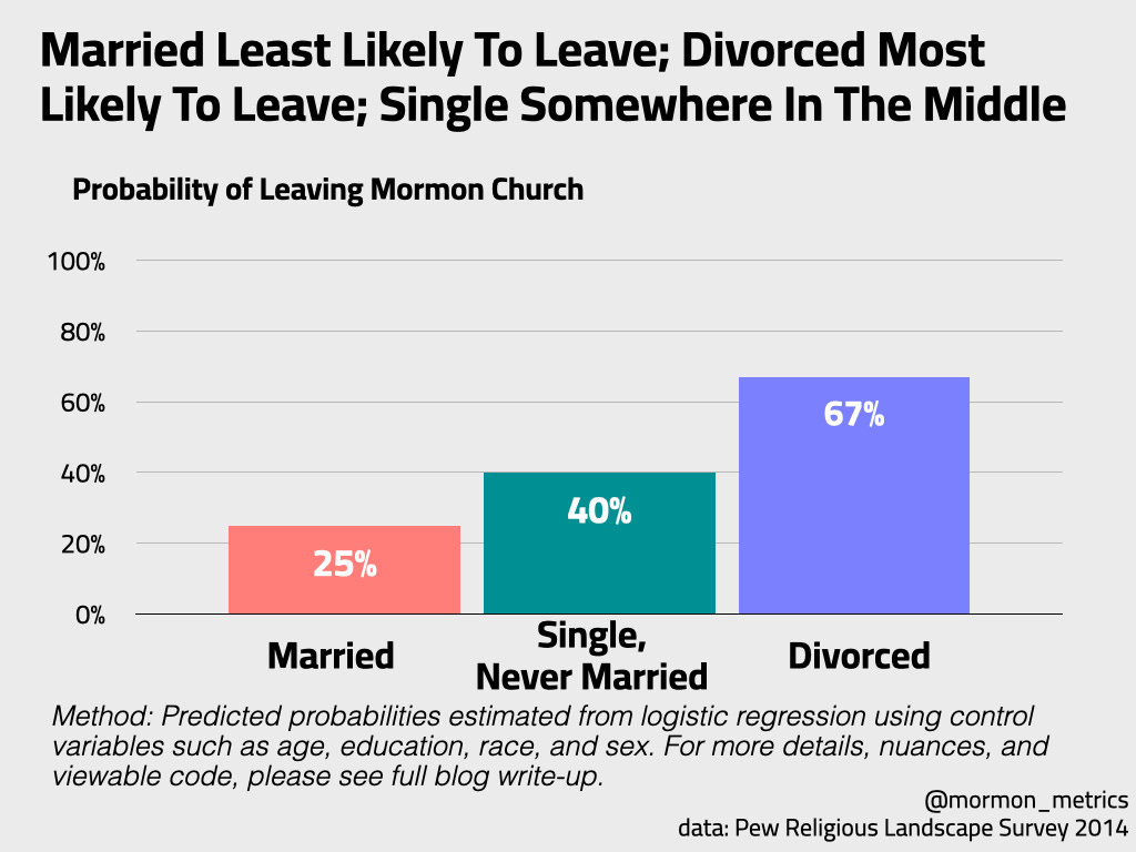 Growing up in the church and attending a single’s ward until I was 27, I often felt a sense of concern from church leadership. It felt like they were worried about us (the singles) leaving and thought we were in a vulnerable state. I think this priming led me to expect the single numbers to look more dire than they actually are! It’s true that the single probability of leaving the church is higher than it is for married people at any age, but to me the divorce numbers look much more problematic than the single numbers.