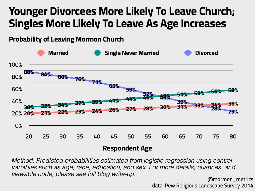This graph suggests that young divorced people are particularly vulnerable to leaving the church. This vulnerability decreases over time presumably as older divorced people are more entrenched in their ways and have access to an easier social connection in their ward after losing the social connection of a spouse. Perhaps, older divorcees are not as adventurous in finding social connections as younger people and rely on their ward more and younger divorcees are more willing to take risks in leaving and finding another community.