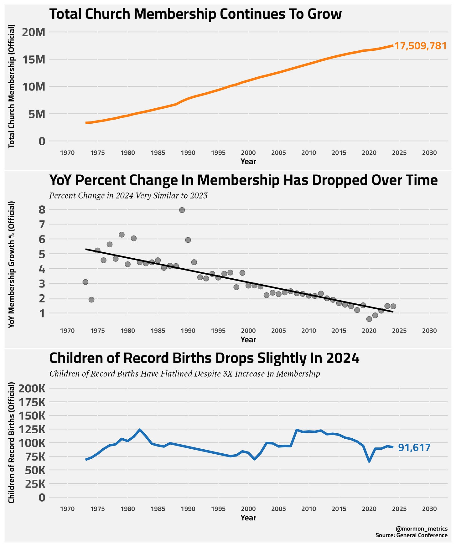 With April General Conference this past weekend, we have facts and statistics released for this year. This link provides a good summary of all of the changes that you can read and also the author plots a few charts here1. I’ll just point out a few positive and negative things that stuck out to me.