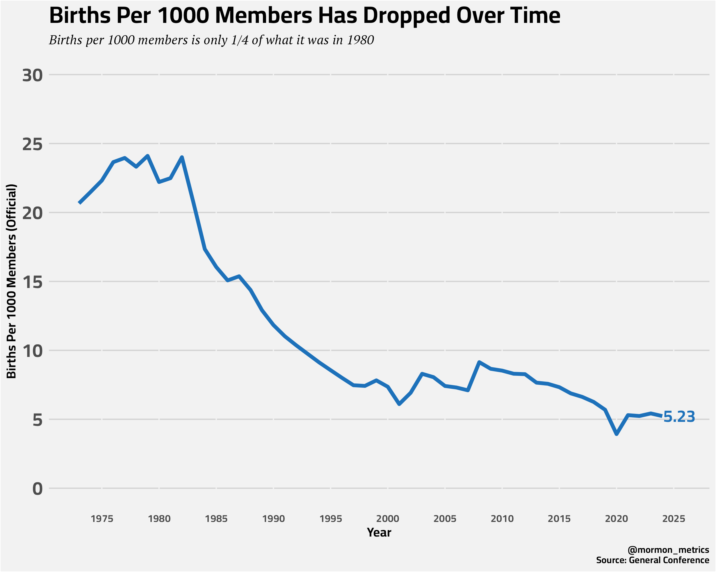 Looking at births per 1000 members, since 1980 it is almost 1/5 of what it was.