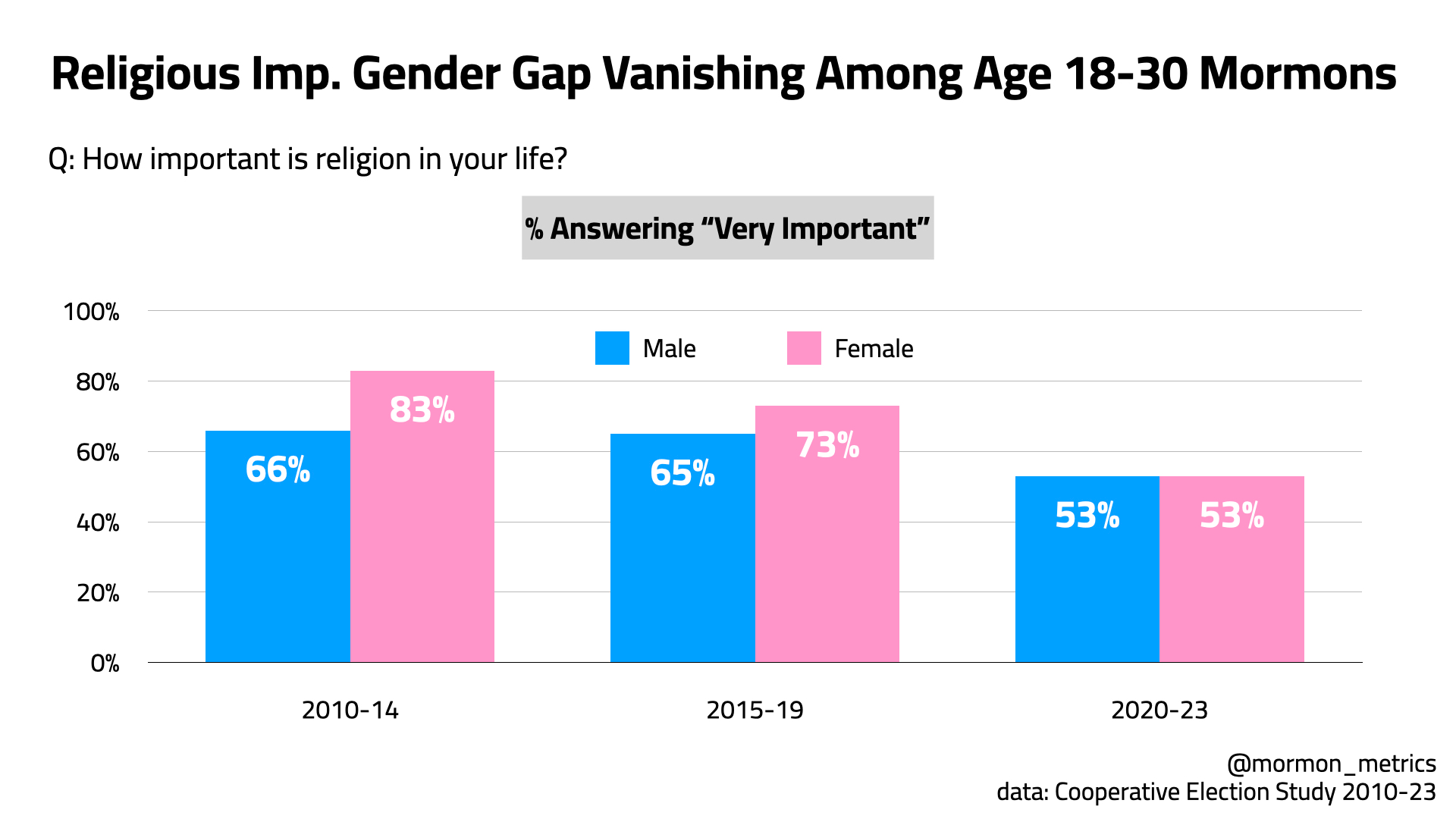 To me, the data is suggestive of a disappearing religious gap between young male and female Mormons and perhaps even a reversal (time will tell). Women are just as likely as Men to say that religion is “very important“ in their life which has not been traditionally true. Also, young mormon women are less likely to attend church weekly than mormon men which is a reversal from the recent past.