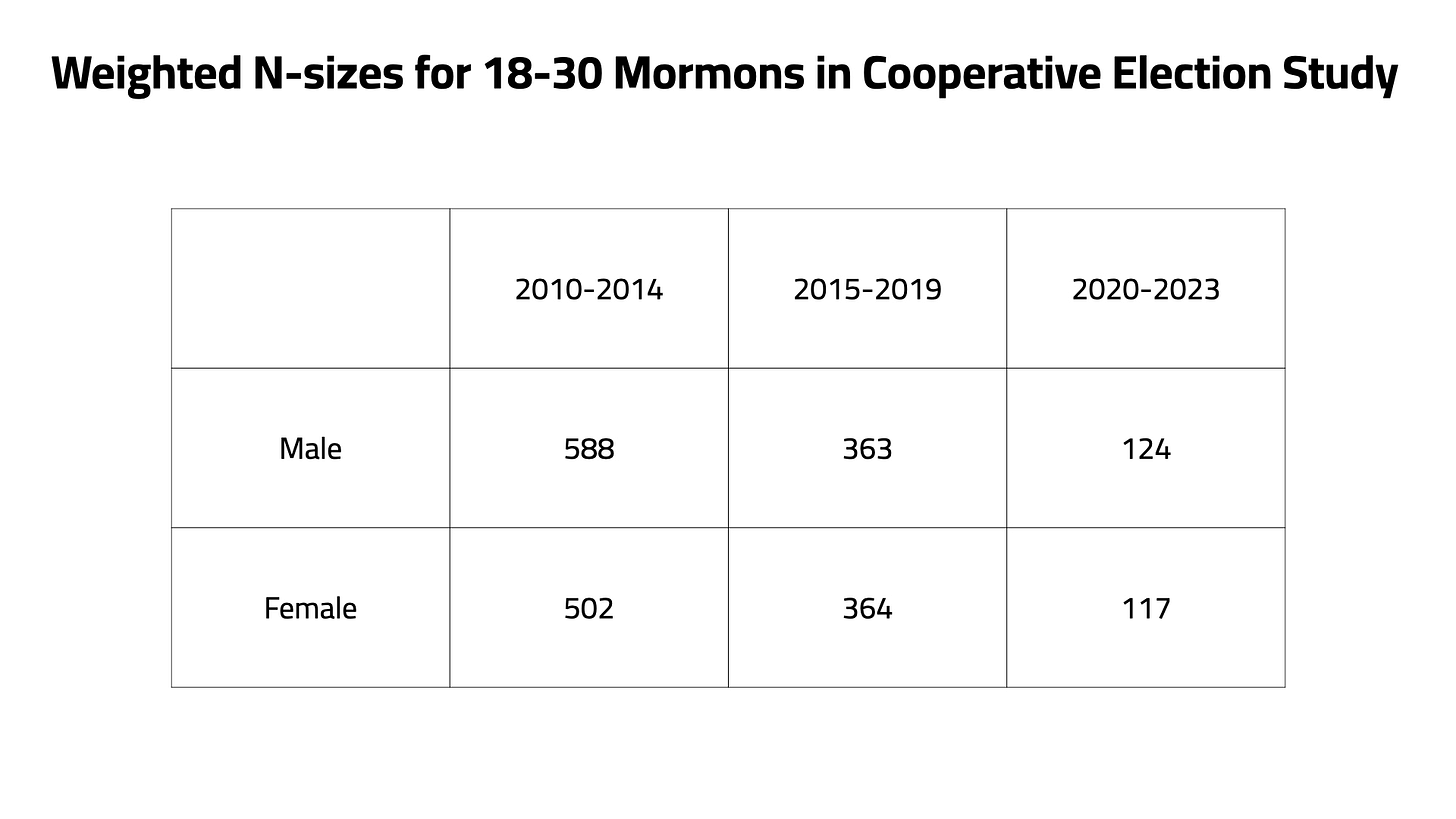 For those interested in the sample sizes in the charts below, I include this table looking at the weighted count of Mormons age 18-30 across 3 time periods in the CES.