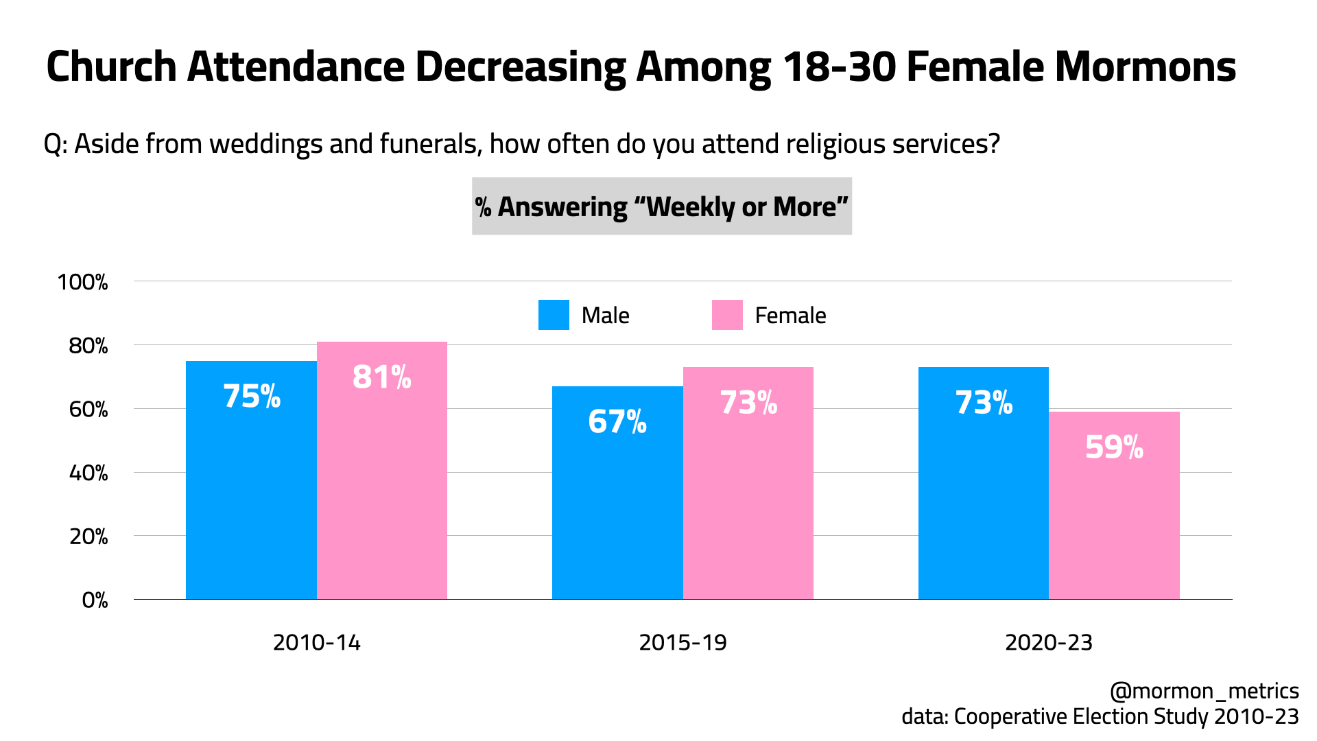While it doesn’t seem that young Mormon male church attendance has significantly changed, we see a decrease in young female Mormon church attendance. In our first time period, women who identified as Mormon were more likely than men to attend church “weekly or more“ than men. Now, self-identifying young Mormon women are less likely to attend “weekly or more“ than their male counterparts.