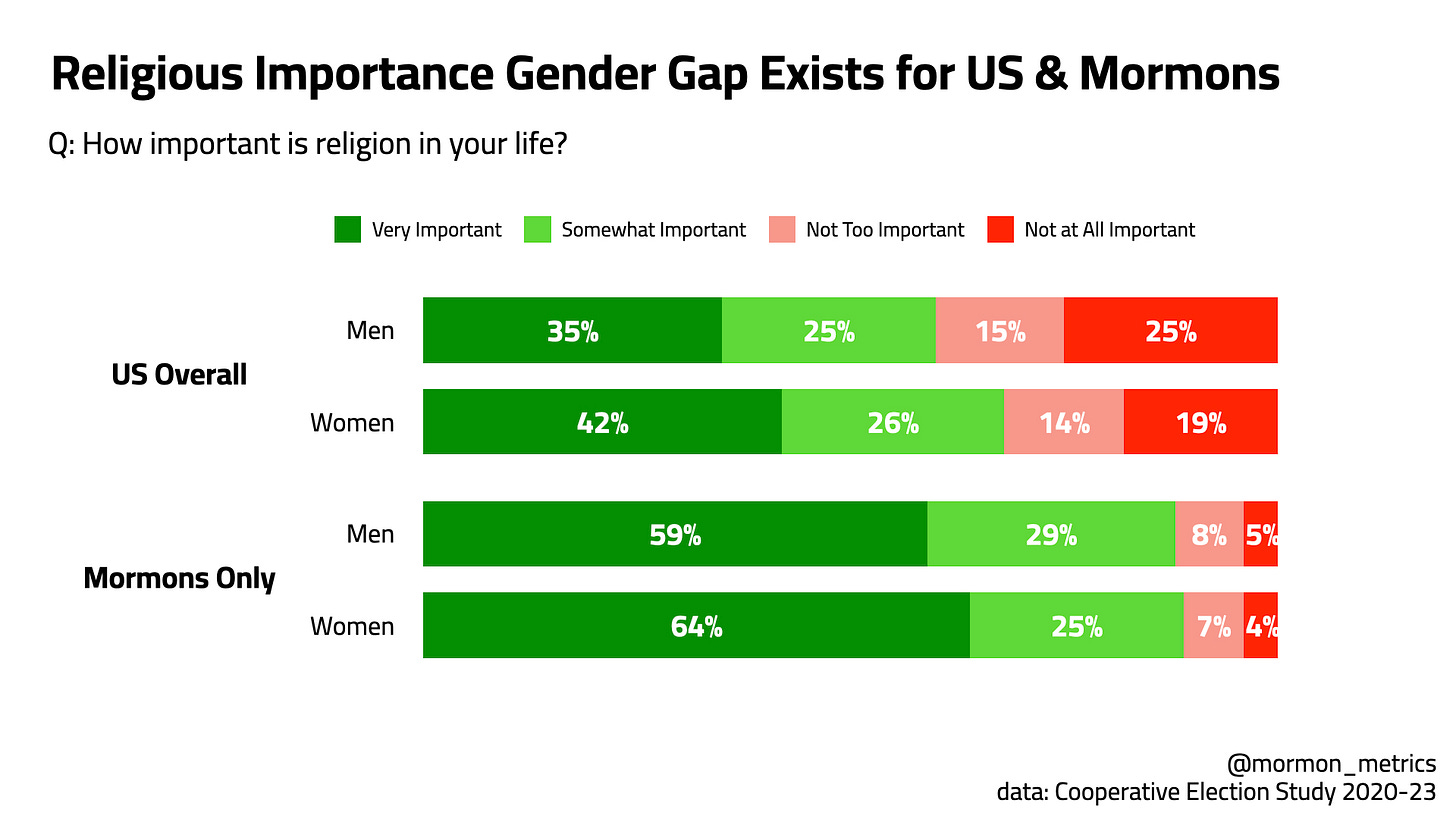 Both Mormons and the US overall have the gender religious gap. It is not HUGE, but it exists. Women are more likely to say Religion is “Very Important“ than men in both groups by 5pts for Mormons and 7pts for the US overall.
